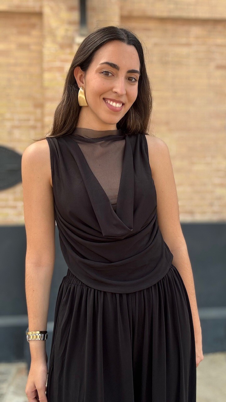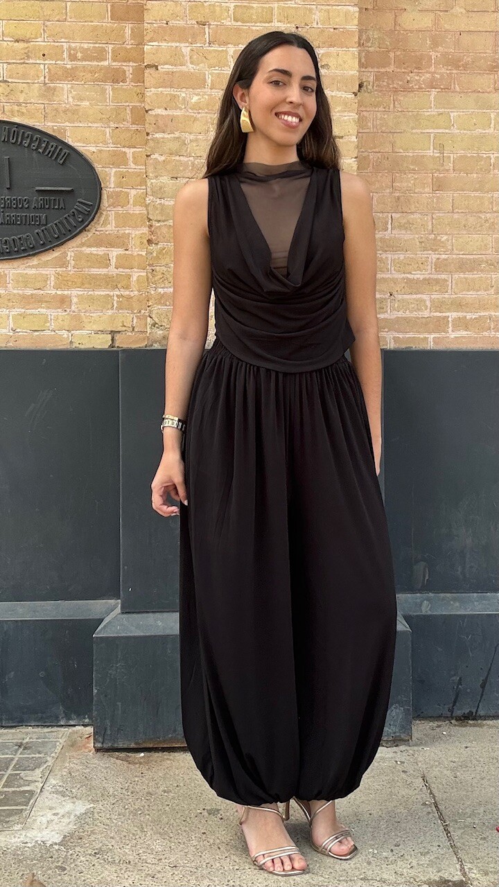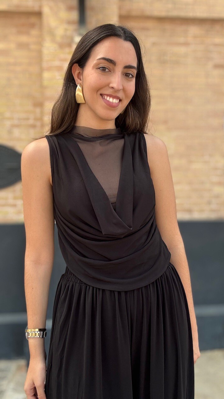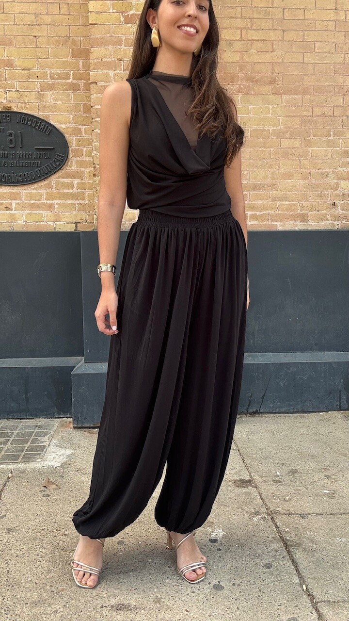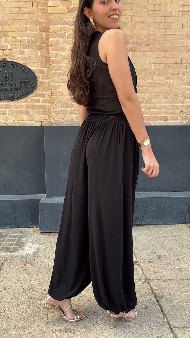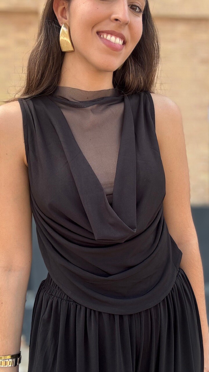 Conjunto compuesto por top de tul de manga corta y pantalón bombacho con cinturilla elástica en color negro. Disponible por tallas.
