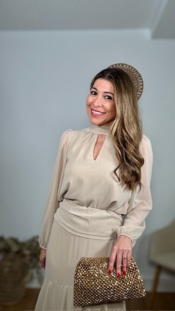 Conjunto de dos piezas confeccionado en tejido de gasa en color beige. Talla única. válida desde la 36 hasta la 40.