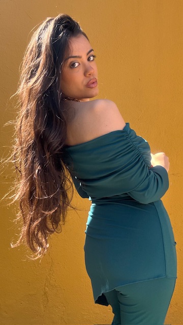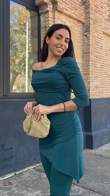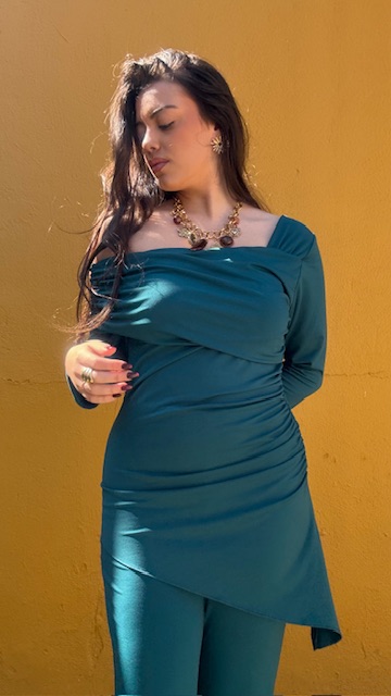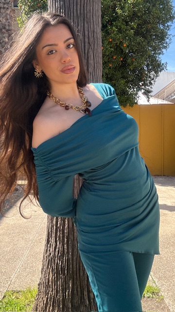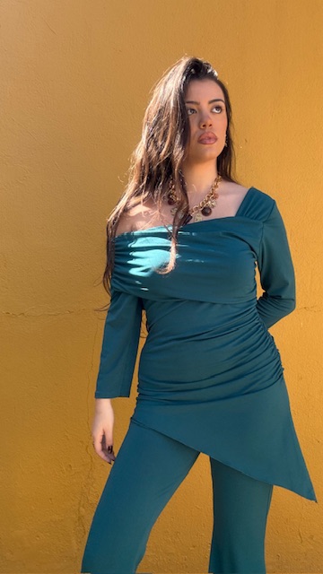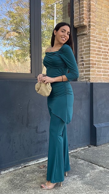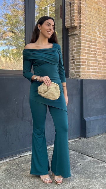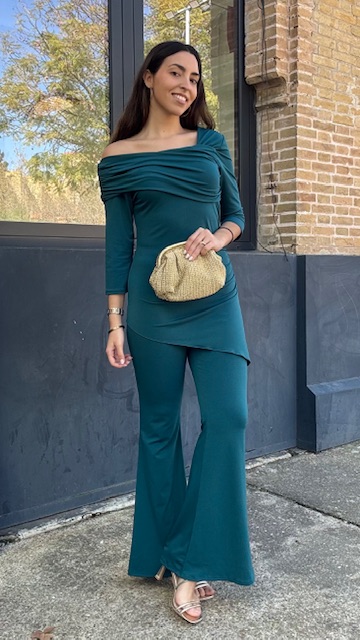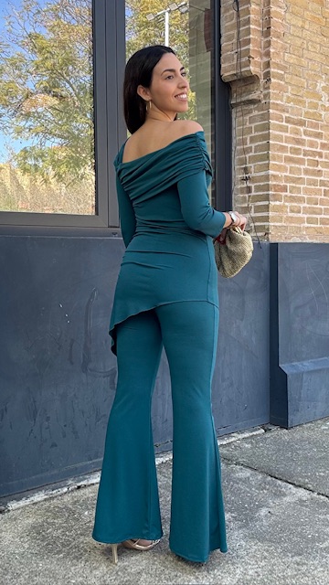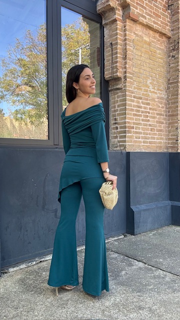 Conjunto de dos piezas en color petróleo formado por top asimétrico con hombro al descubierto y pantalón campana con cinturilla elástica. Talla única válida desde la talla 36 hasta la talla 40/42.