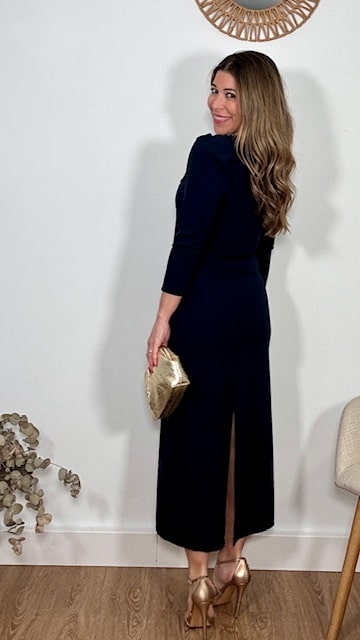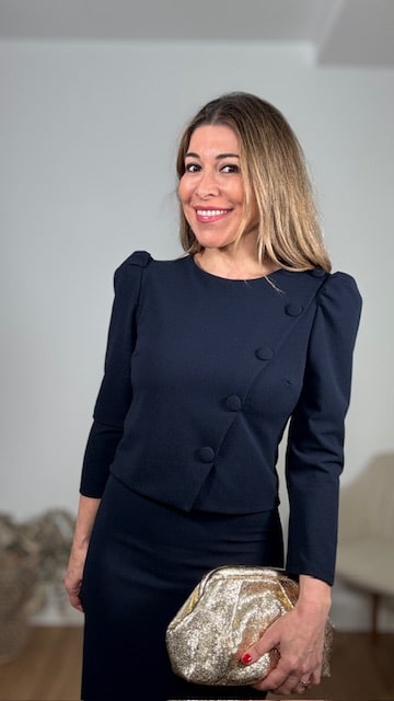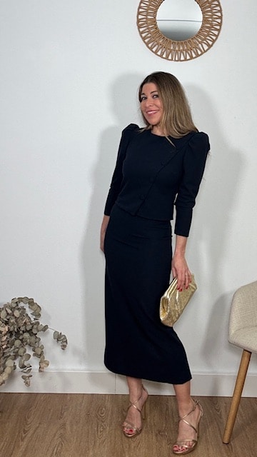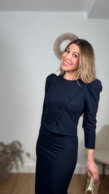 Conjunto de dos piezas confeccionado en tejido de crepe elástico en color azul marino. Talla única con elastano válido desde la 36 hasta la 42.