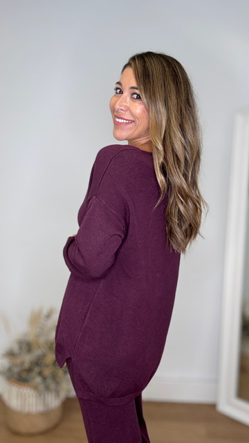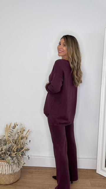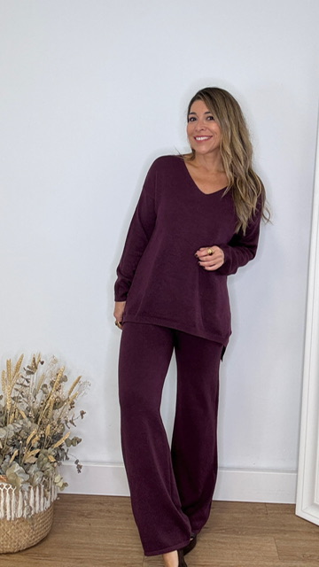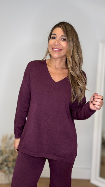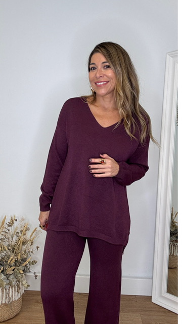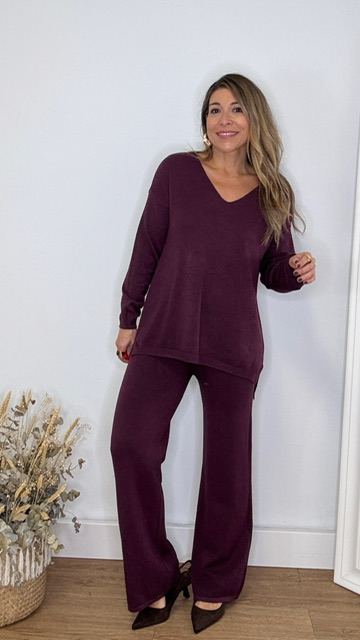Conjunto de punto con escote de pico en color berenjena. Talla única válida desde la 36 hasta la 44.