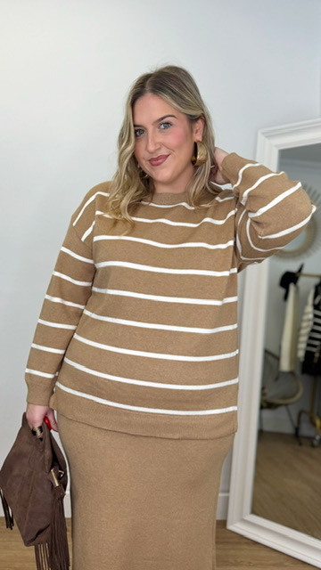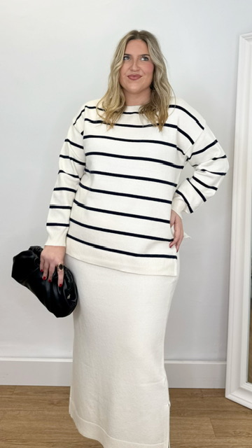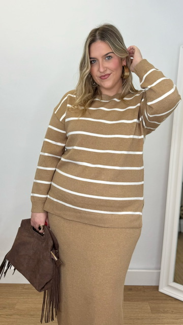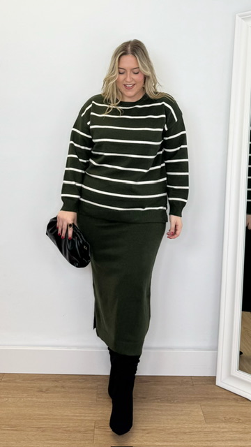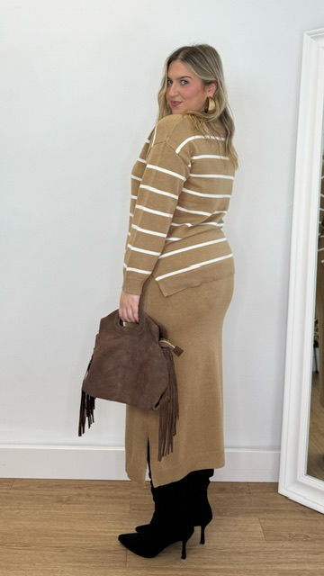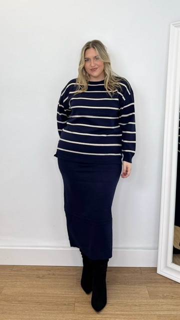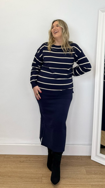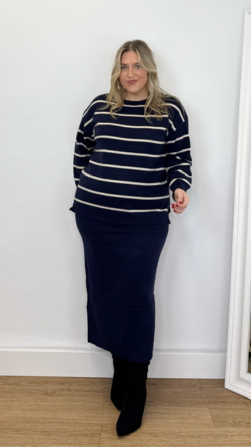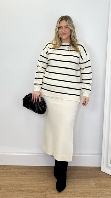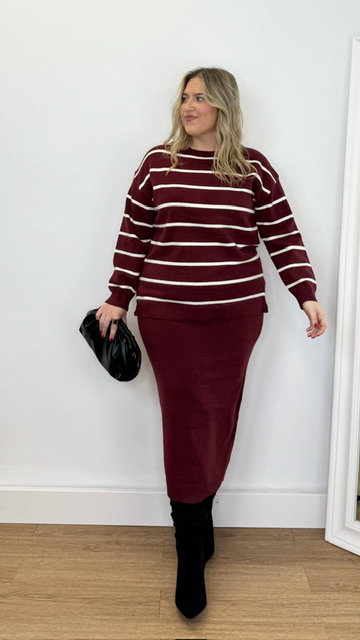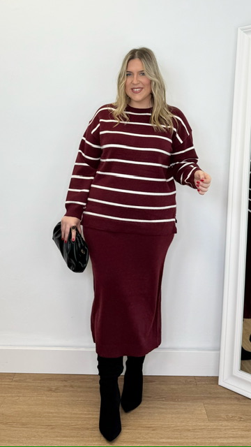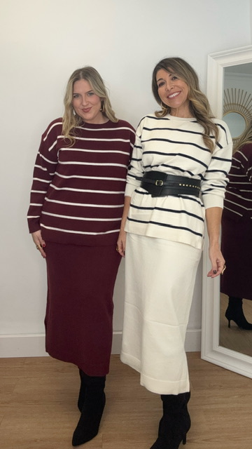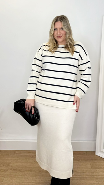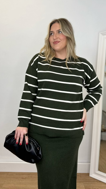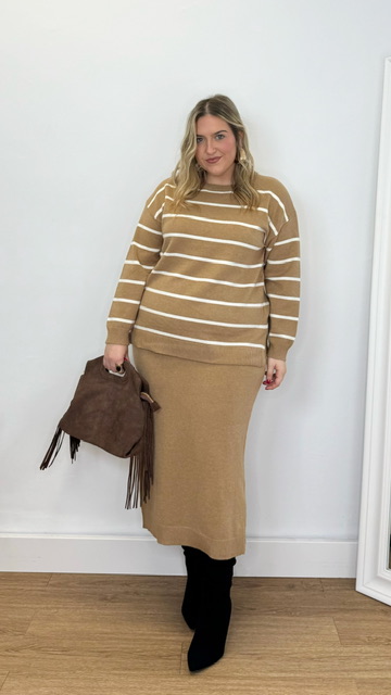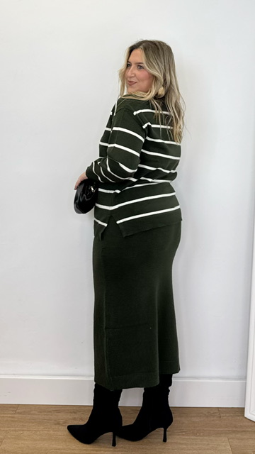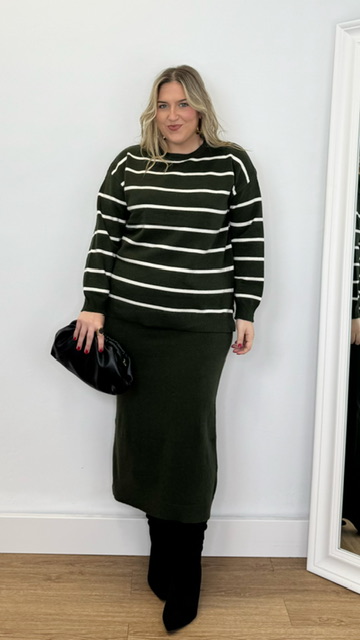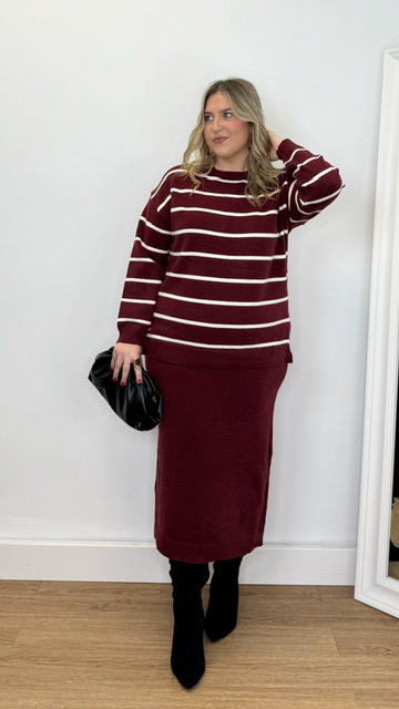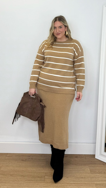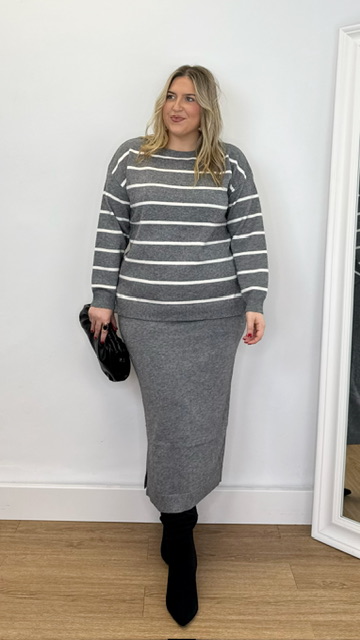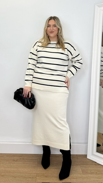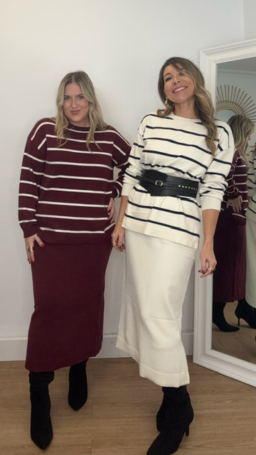 Conjunto de jersey y falda confeccionado en tejido de punto. Talla única válida desde la 36 hasta la 44.