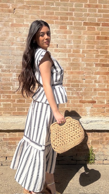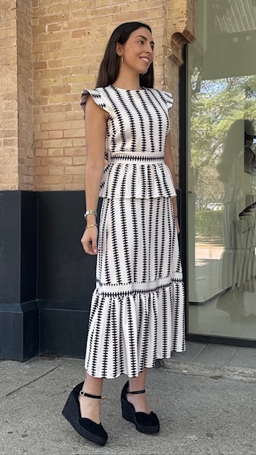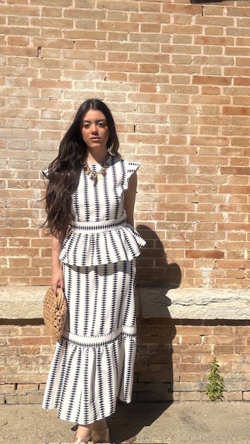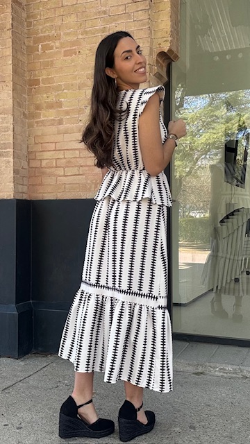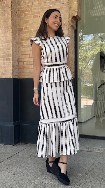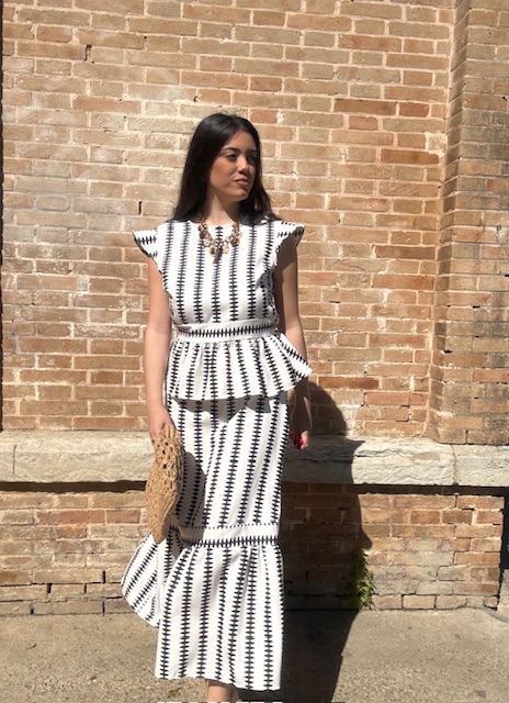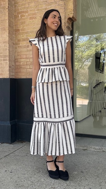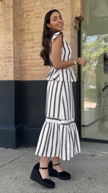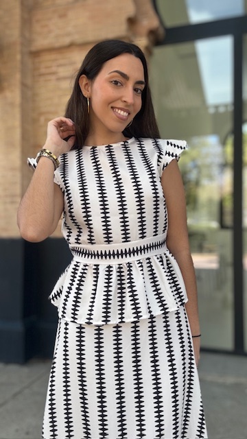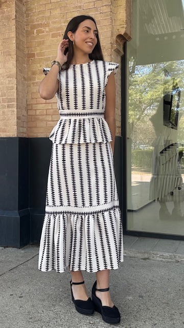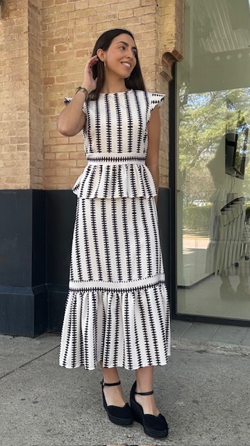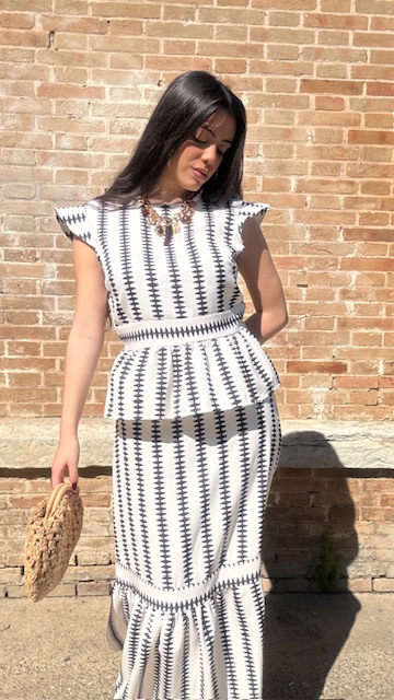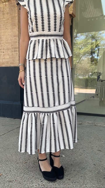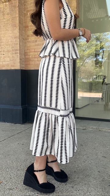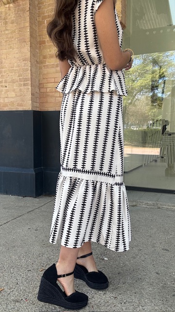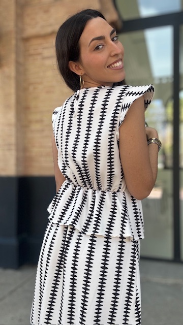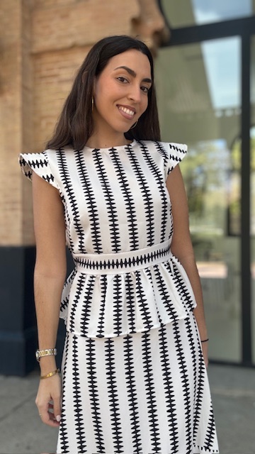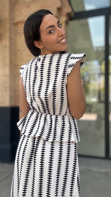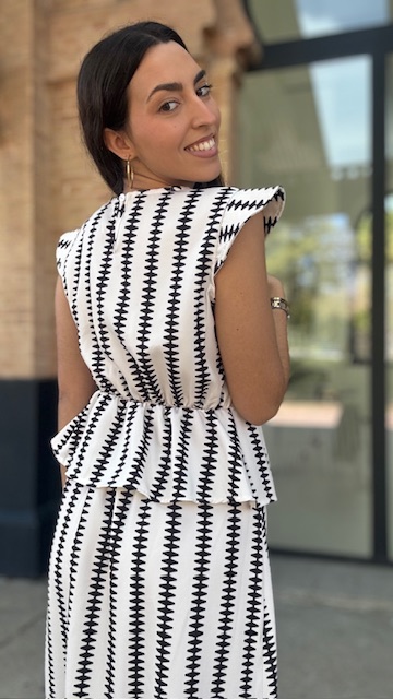 Conjunto de dos piezas en color blanco con estampado en color negro formado por top con manga a la sisa y volantes en la terminación. La falda es midi con cinturilla elástica con volante en la terminación al igual que el top. Talla única válida desde la talla 36 hasta la 42.
