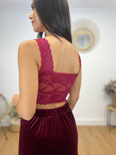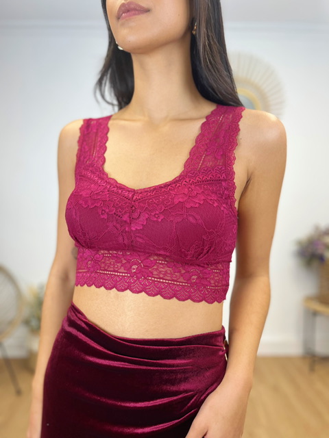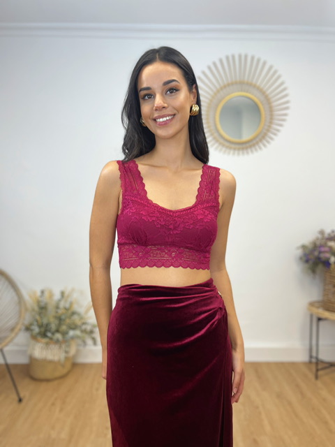 Croptop de tirantes de estilo lencero a modo de corpiño confeccionado en tejido de encaje con cascos incorporados. Talla única válida para tallas SML.