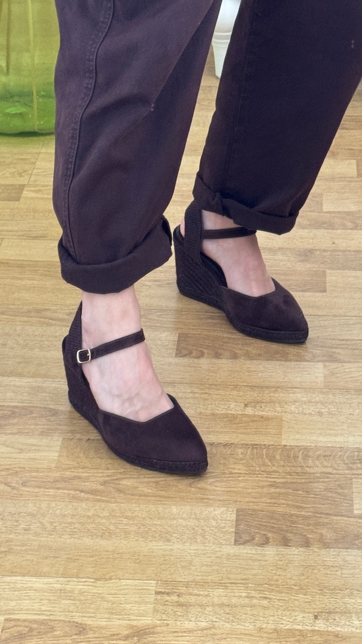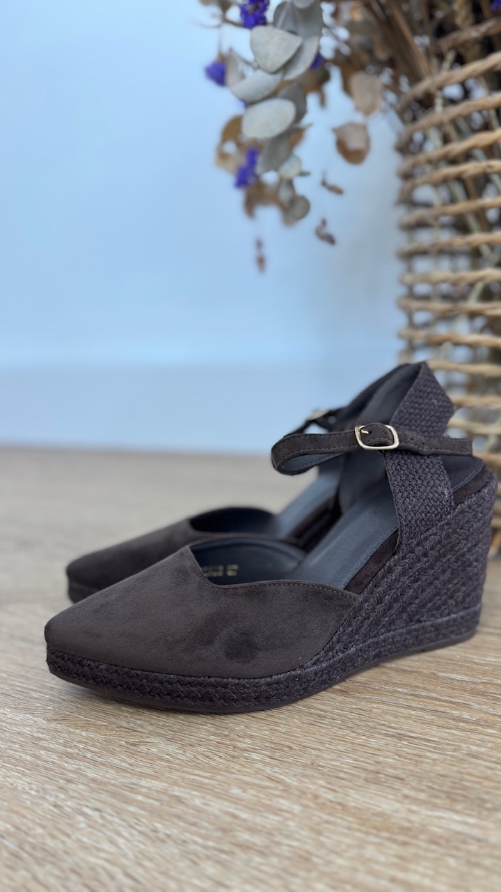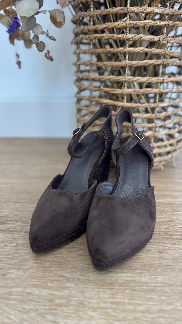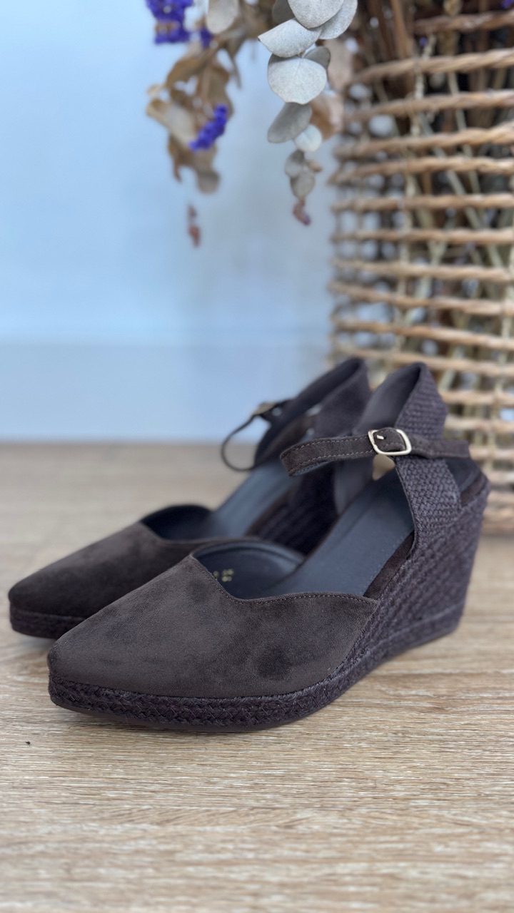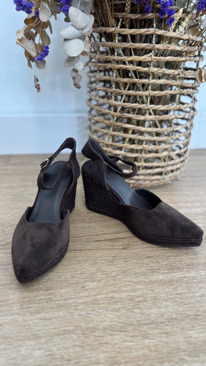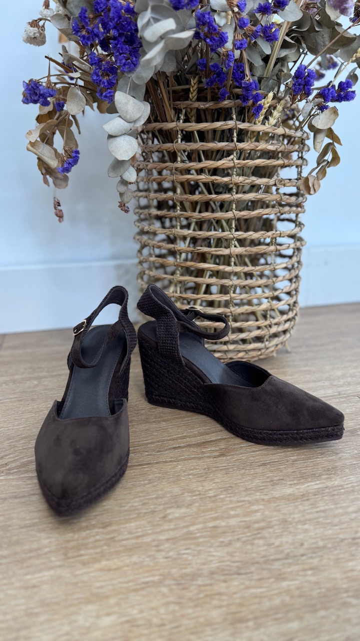 Cuñas de esparto de antelina con puntera de pico en color marrón y plantilla acolchada.Cuña 8 cm Plataforma 2 cm. Disponible por tallas.