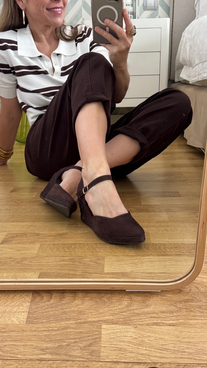 Cuñas de esparto de antelina con puntera de pico en color marrón y plantilla acolchada.Cuña 8 cm Plataforma 2 cm Disponible por tallas.