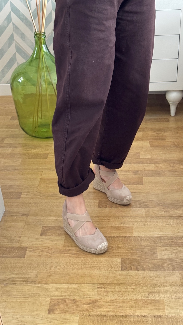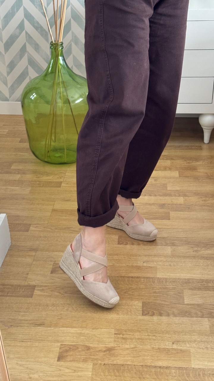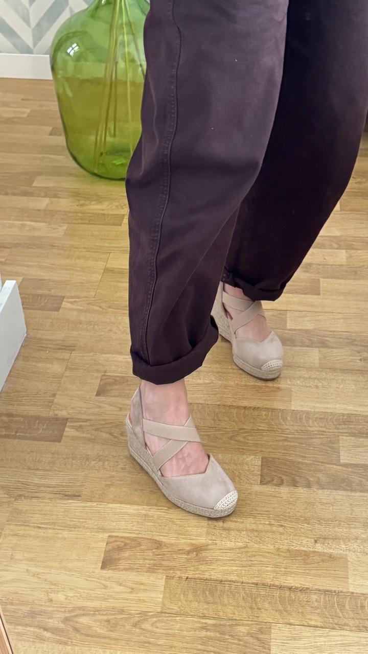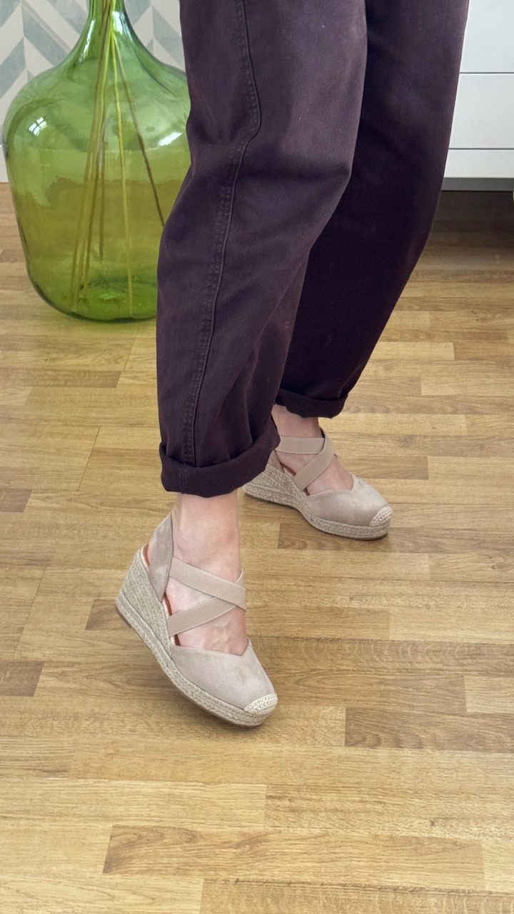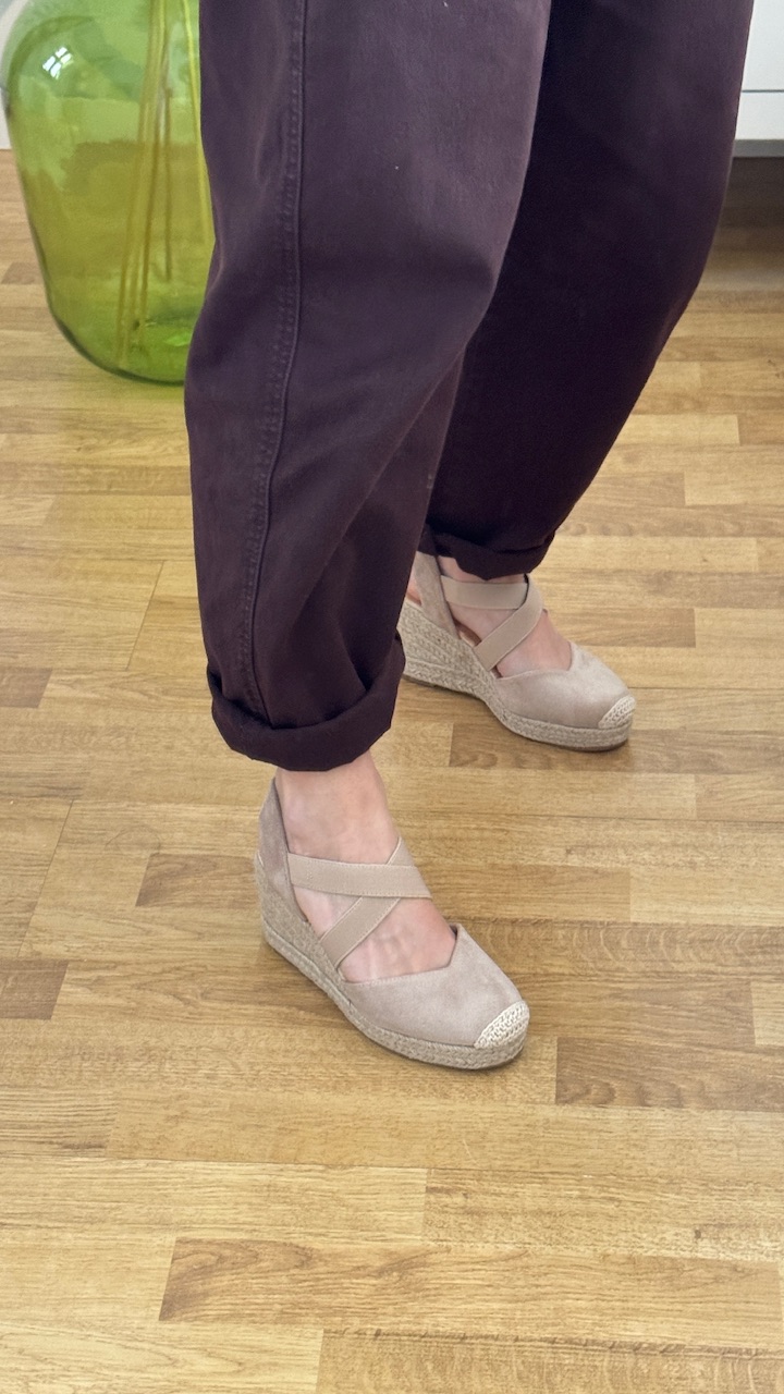 Cuña de esparto en color beige con tiras elásticas en la parte frontal. Cuña 7 cm plataforma 2cm . Disponible por tallas.