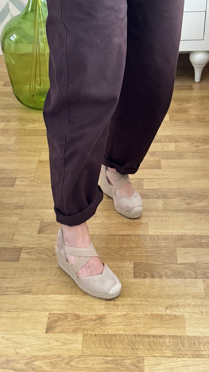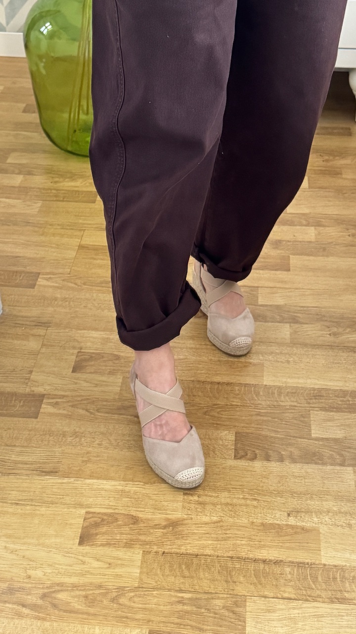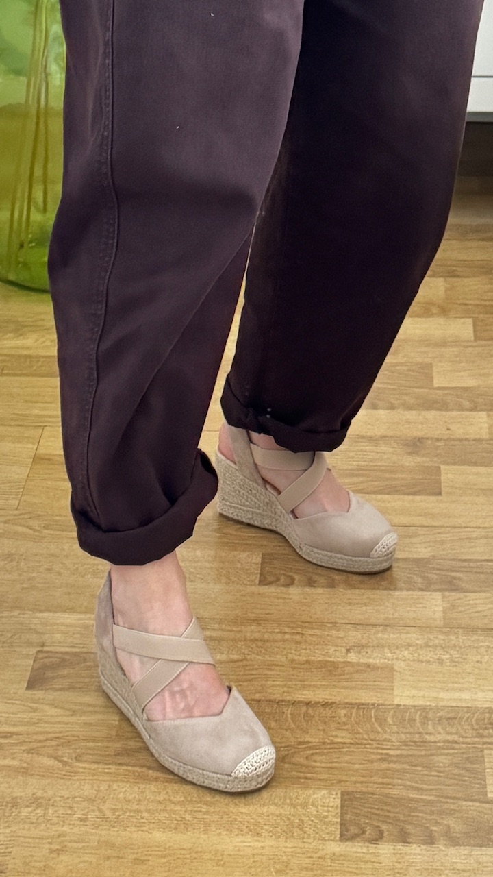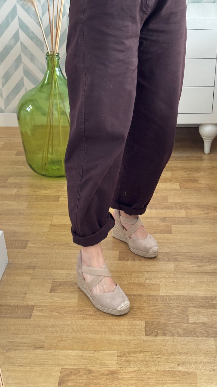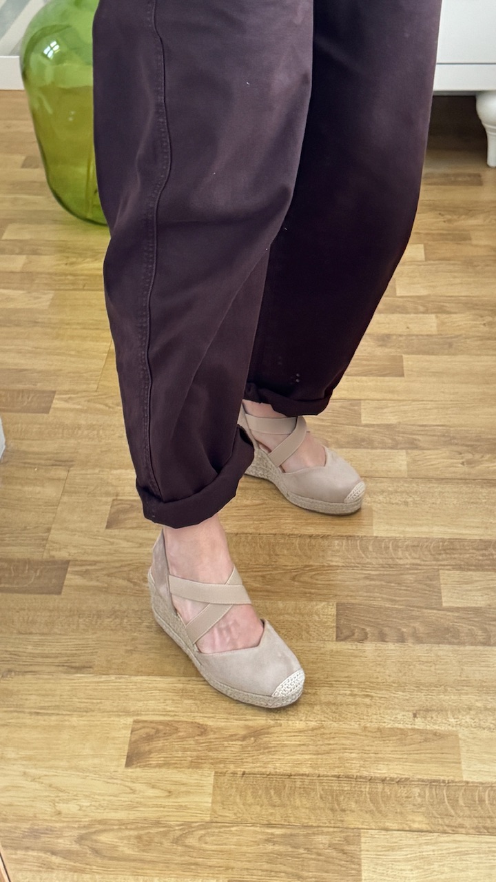 Cuña de esparto en color beige con tiras elásticas en la parte frontal. Cuña 7 cm plataforma 2cm . Disponible por tallas.