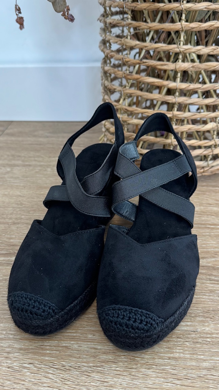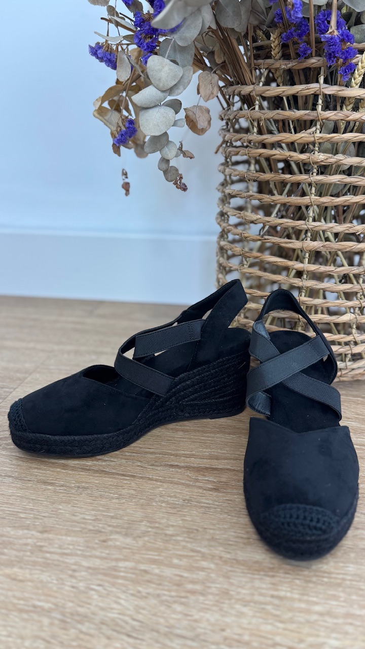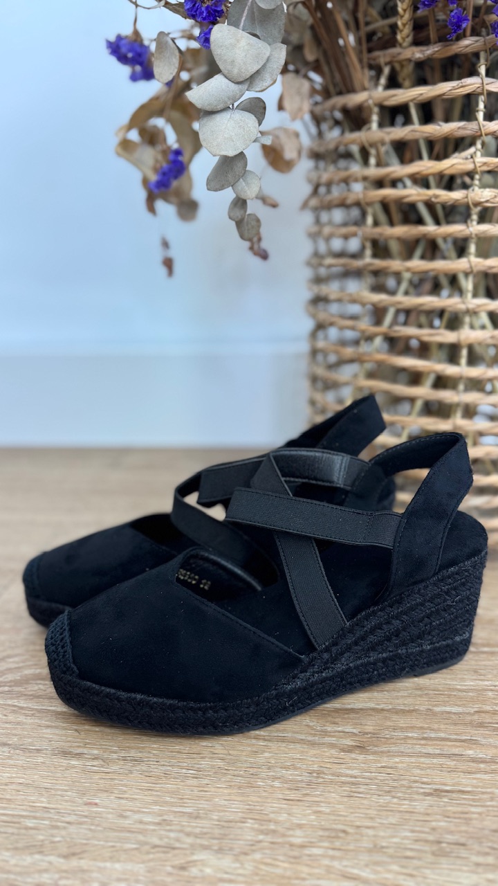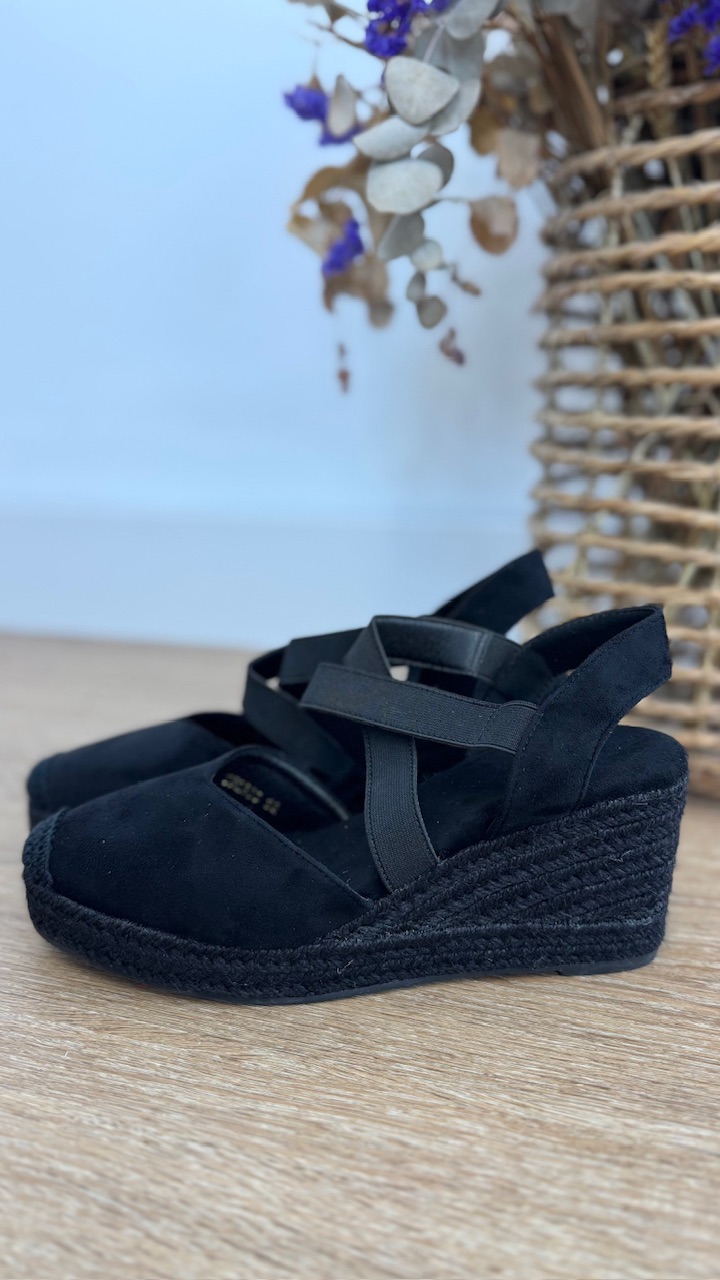 Cuña de esparto en color negra con tiras elásticas en la parte frontal. Cuña 7 cm plataforma 2cm . Disponible por tallas.