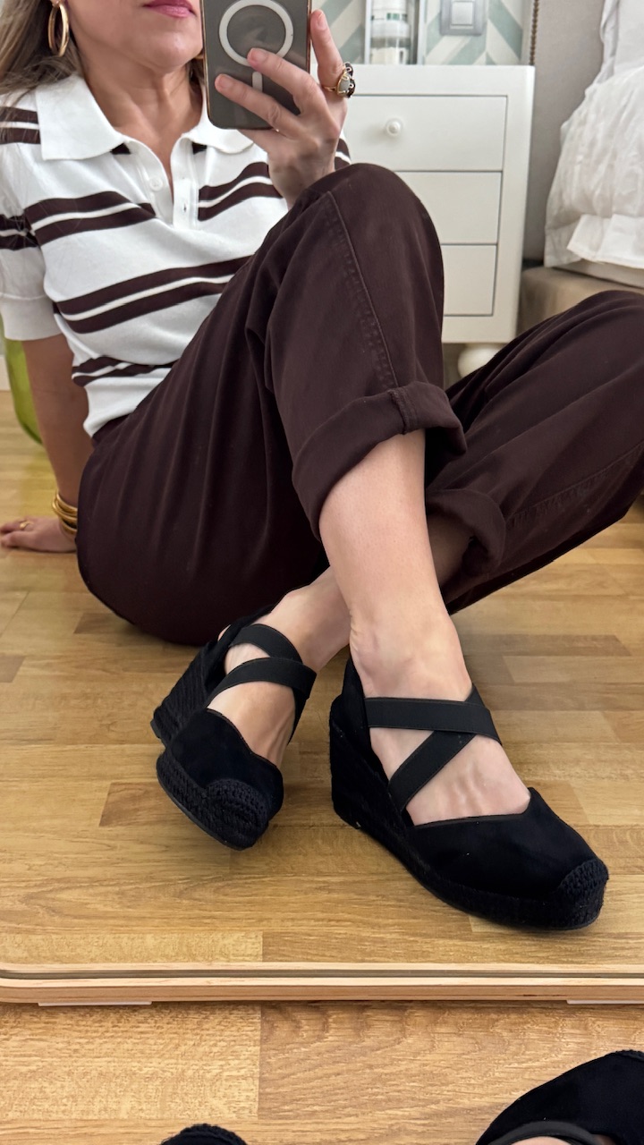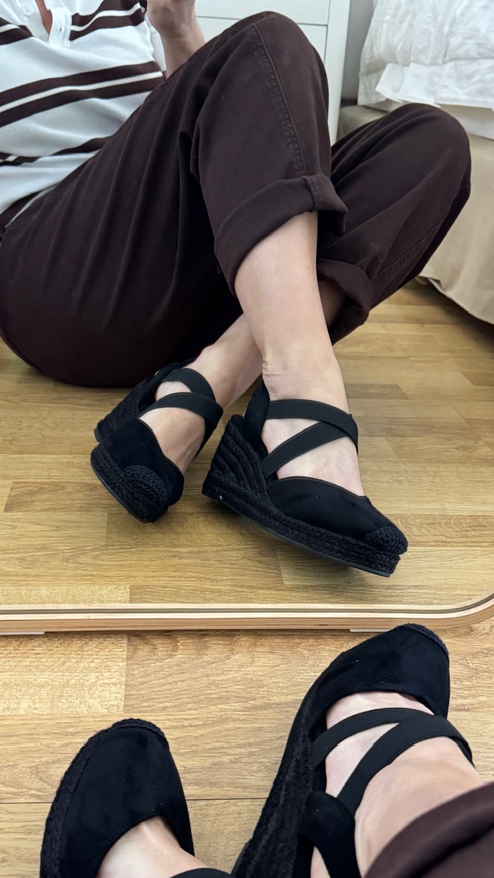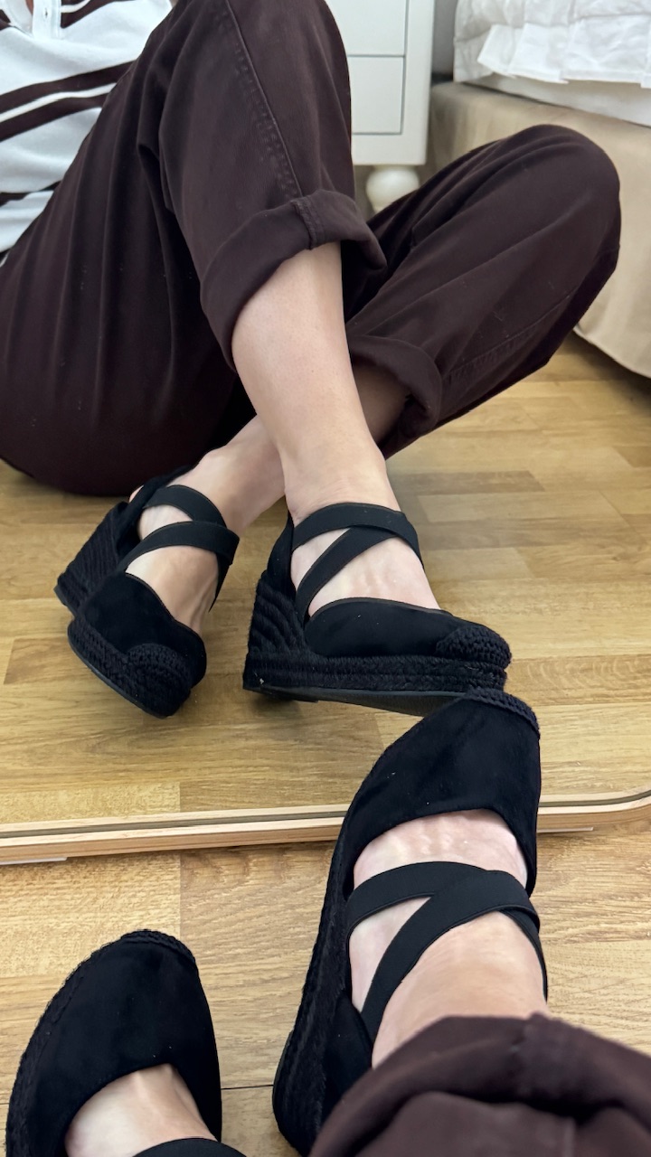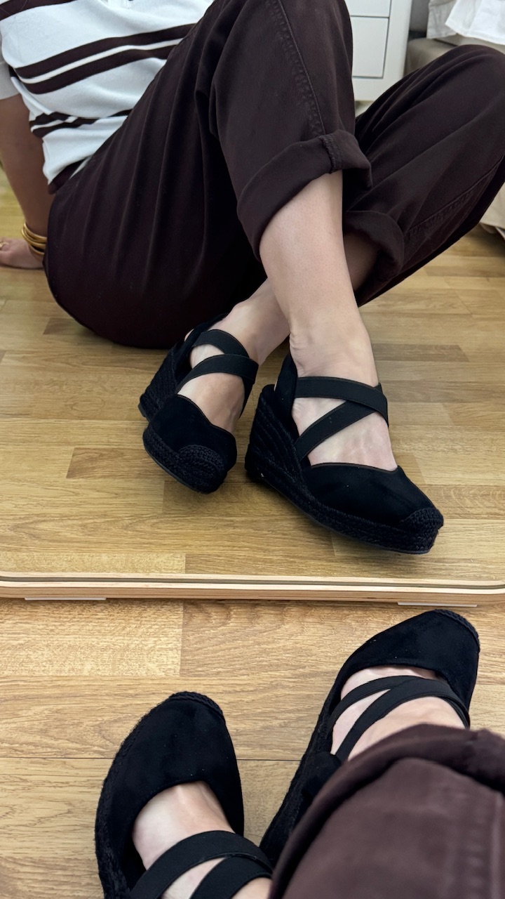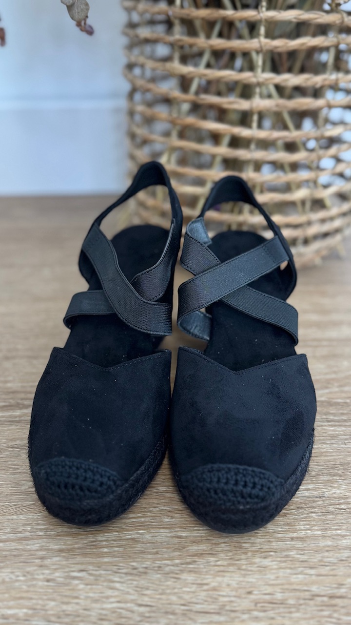 Cuña de esparto en color negra con tiras elásticas en la parte frontal. Cuña 7 cm plataforma 2cm . Disponible por tallas.