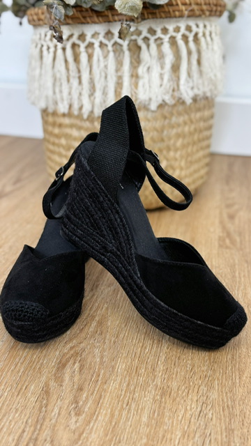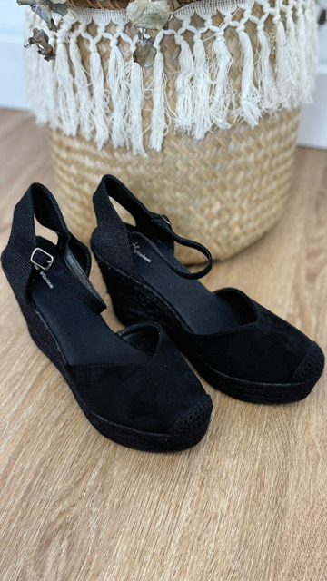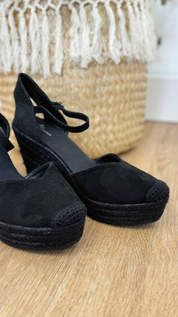 Cuñas de esparto negras con 9 cm de tacón y 3 cm de plataforma.