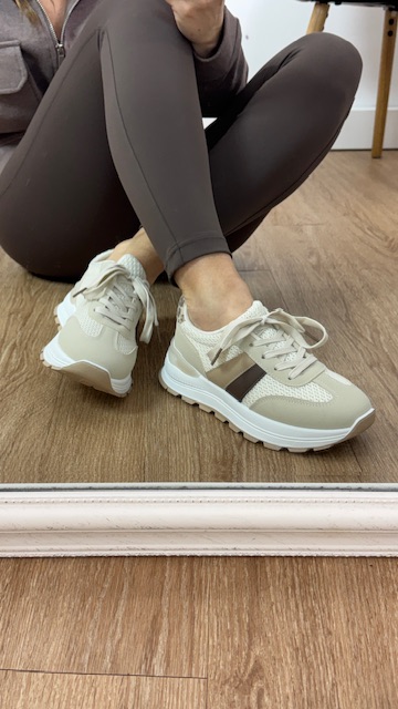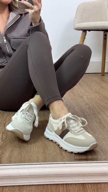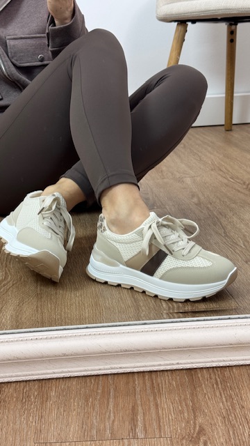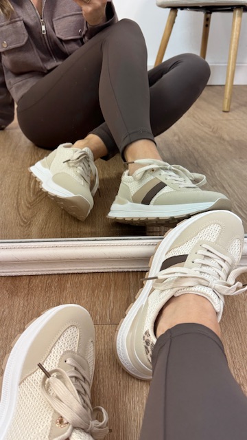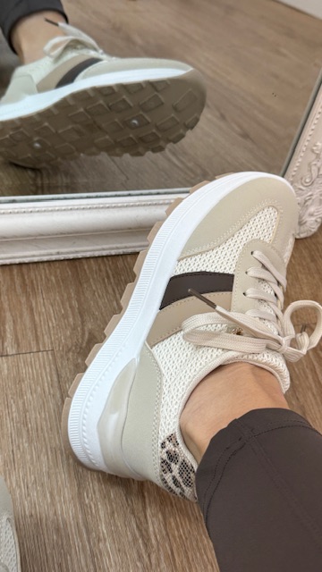 Deportivas en color beige con rayas en la parte lateral en tonos camel y marrón chocolate, llevan detalle en talón con estampado animal. Tallan normal, elige tu talla habitual.