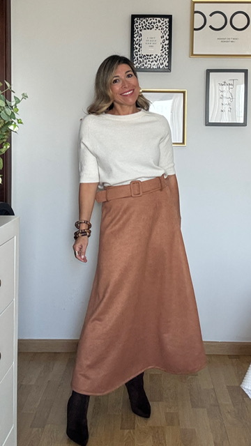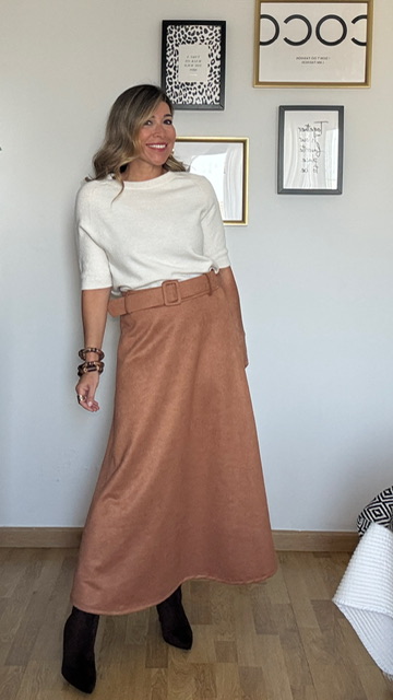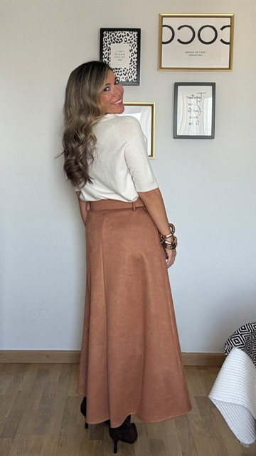 Falda de antelina con cinturón en color calabaza. Talla única válida desde la 36 hasta la 44.