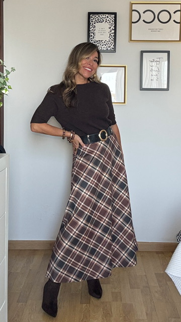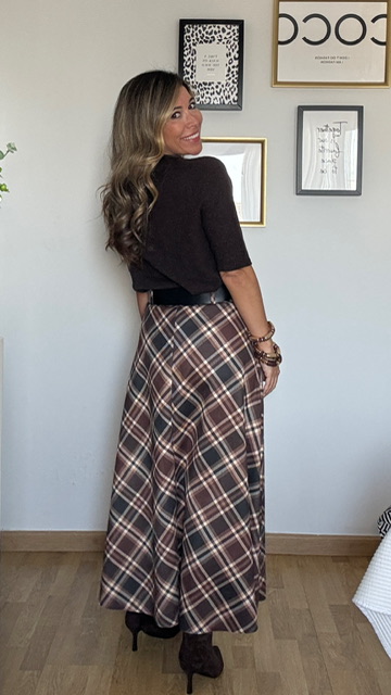 Falda de antelina con cinturón en color negro con estampado. Talla única válida desde la 36 hasta la 44.