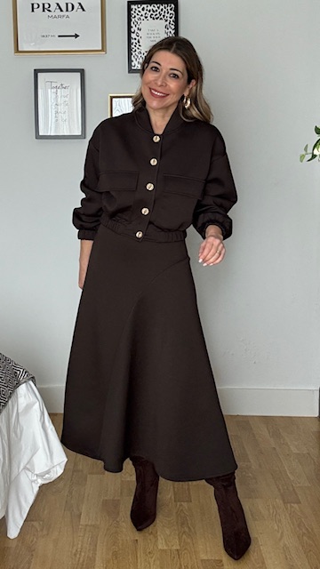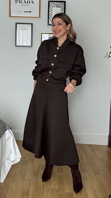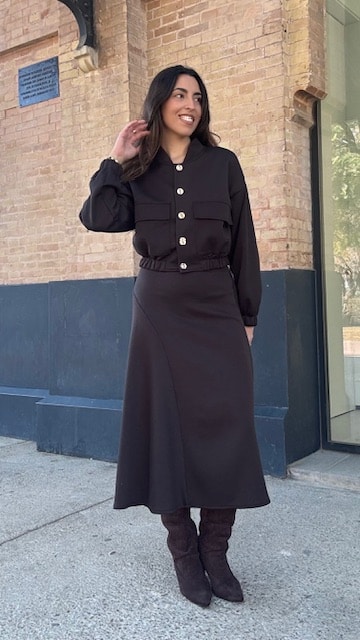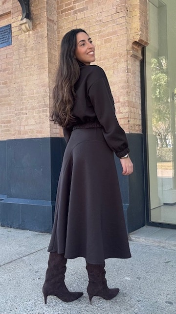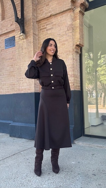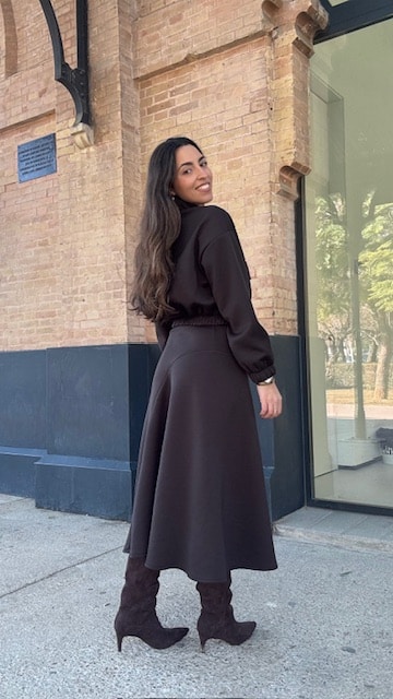 Falda capa midi en color marrón. Talla única válida desde la 36 hasta la talla 44.