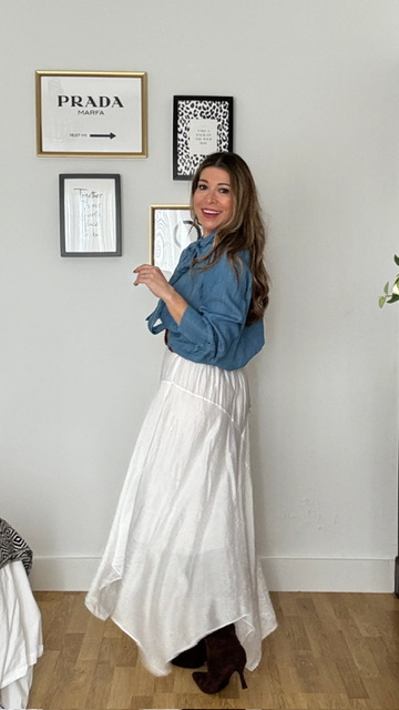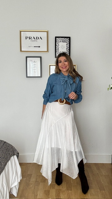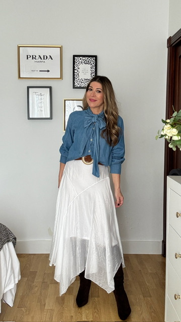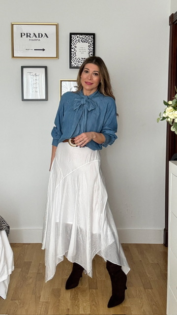 Falda de corte asimétrico confeccionada en tejido sedoso en color blanco. Lleva forro interior y cinturilla elástica. Talla única válida desde la 36 hasta la 42.