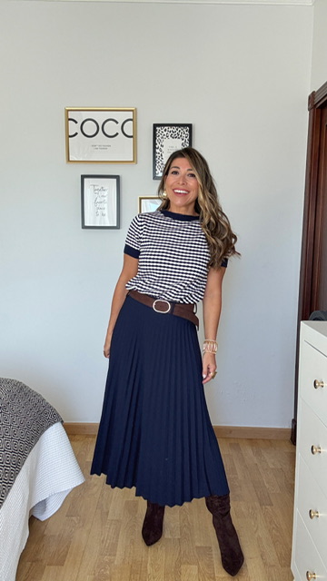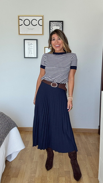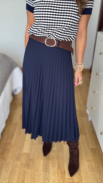 Falda confeccionada en tejido de crepe de tablitas en azul marino. Talla única válida desde la 36 hasta la 42.