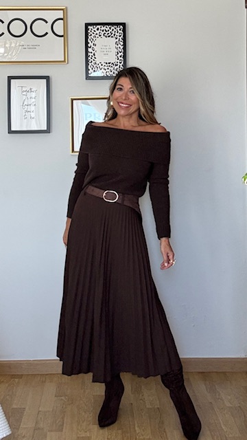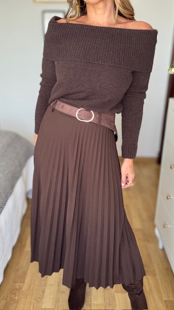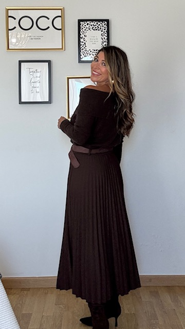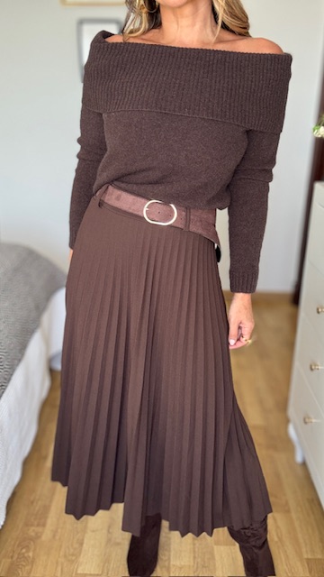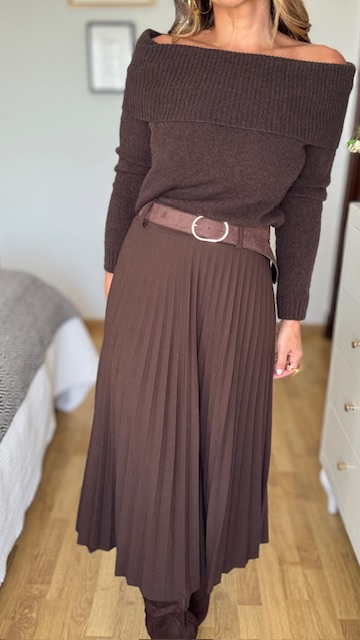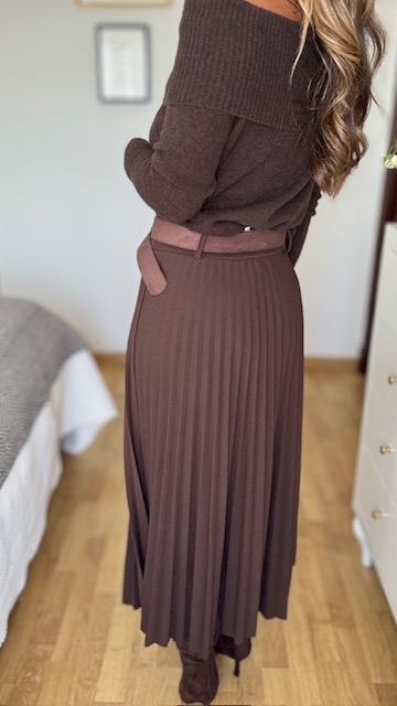 Falda confeccionada en tejido de crepe de tablitas en marrón. Talla única válida desde la 36 hasta la 42.