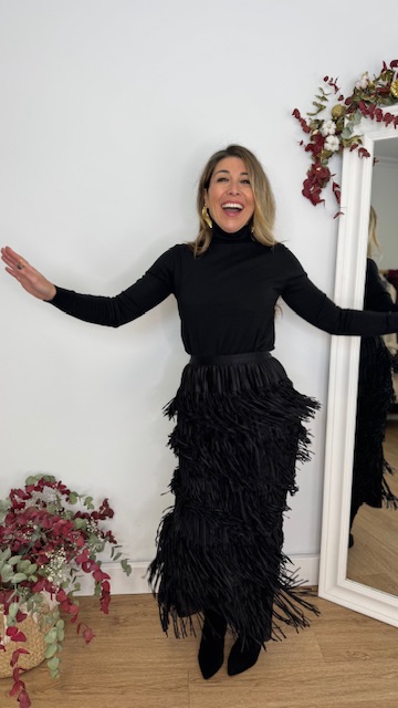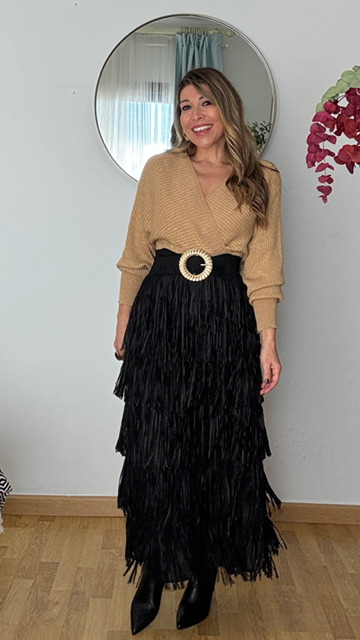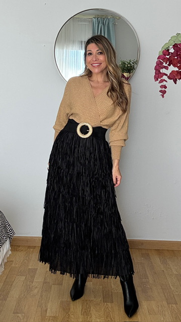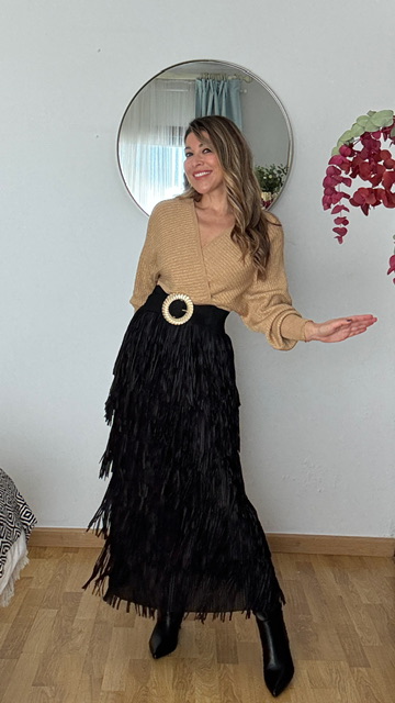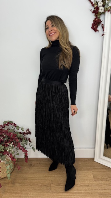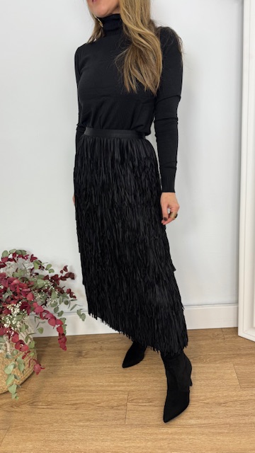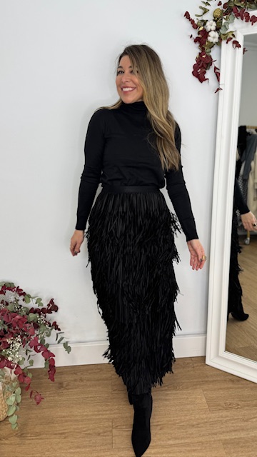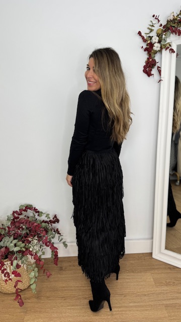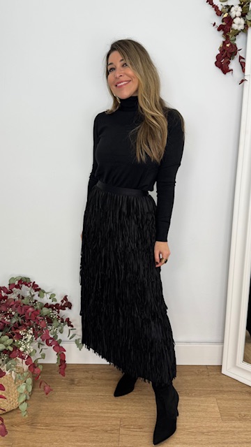 Falda de flecos en color negro. Talla única válida desde la 36 hasta la 42.