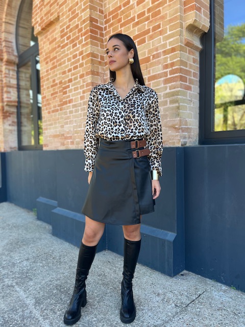 Falda confeccionada en tejido de polipiel en color negra. Talla única válida desde la 36 hasta la talla 40. Perfecta para combinarla con la Camisa Satén Animal