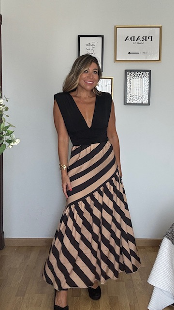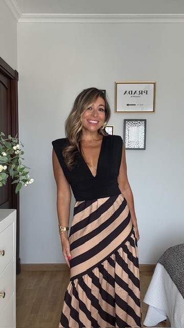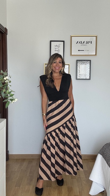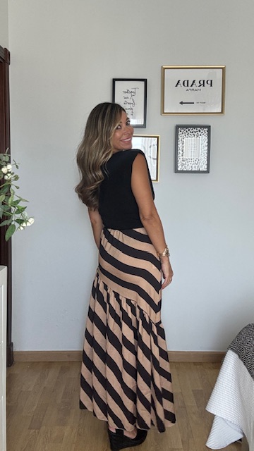 Falda confeccionada en tejido simulando al lino con rayas en color camel y negro. Talla única válida desde la talla 36 hasta la talla 40