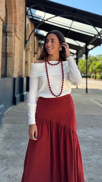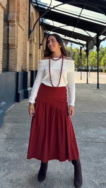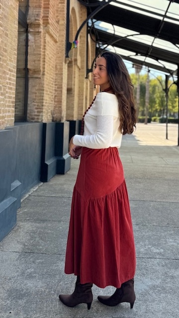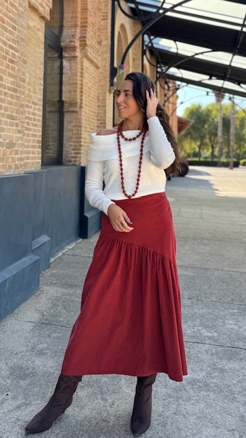 Falda de pana en color teja con cinturilla elástica. Talla única desde la 36 hasta la 40.