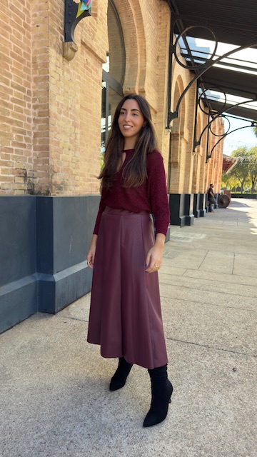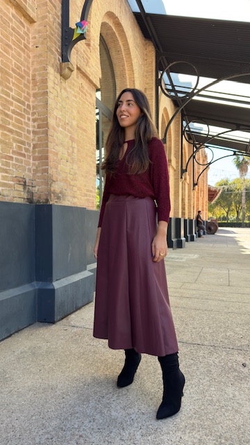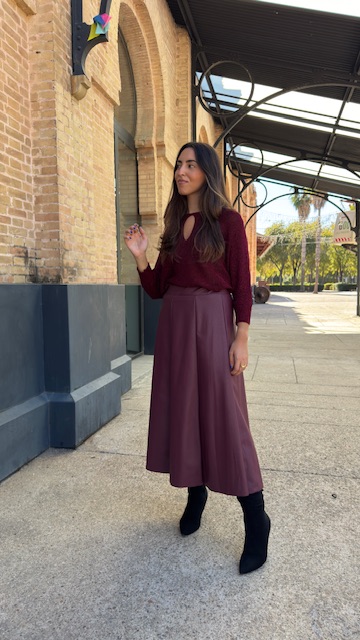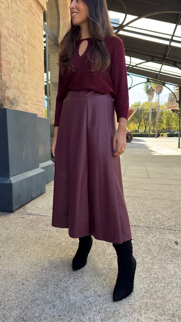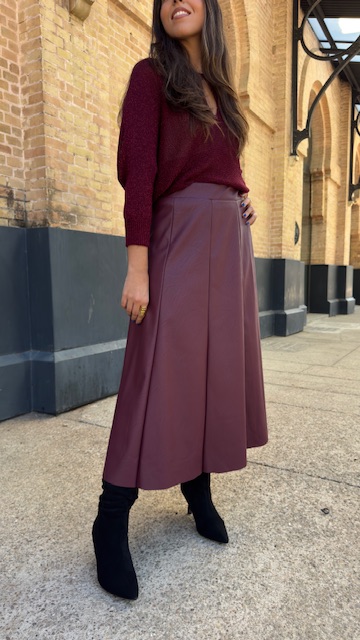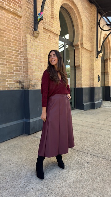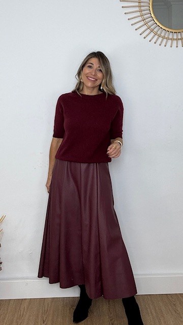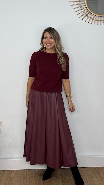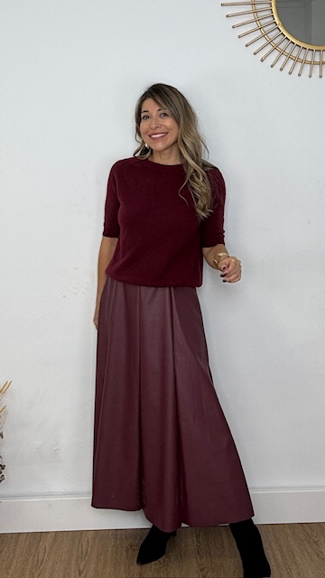 Falda de polipiel en color burdeos. Talla única válida desde la 36 hasta la 42.