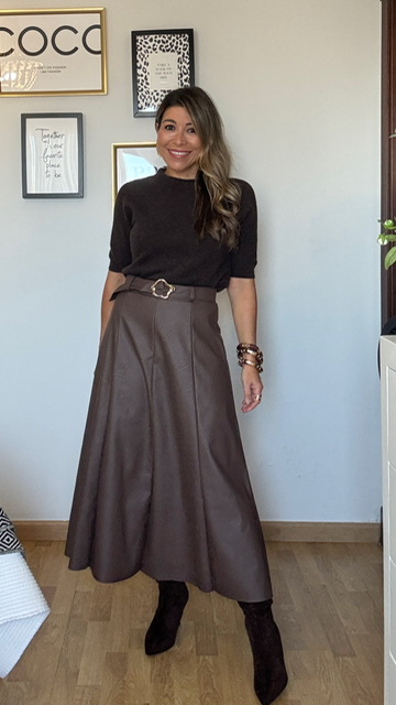 Falda de capa confeccionada con tejido de polipiel con cinturón con hebilla dorada. Disponible por tallas.