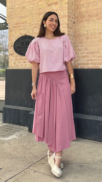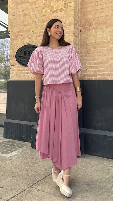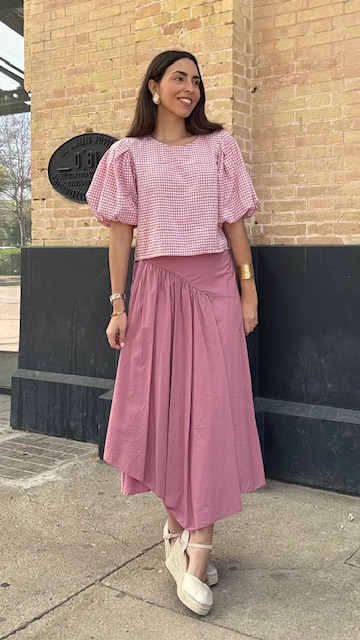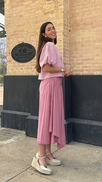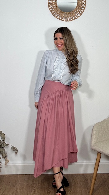 Falda larga de corte asimétrico en color rosa empolvado, lleva cinturilla elástica. talla única válida desde la 36 hasta la 42.