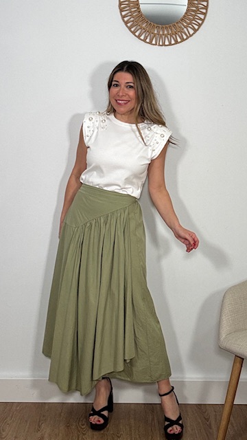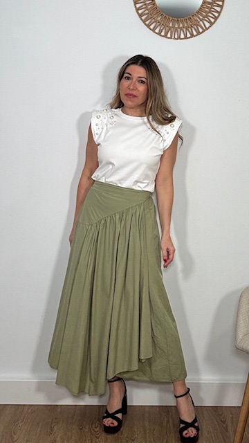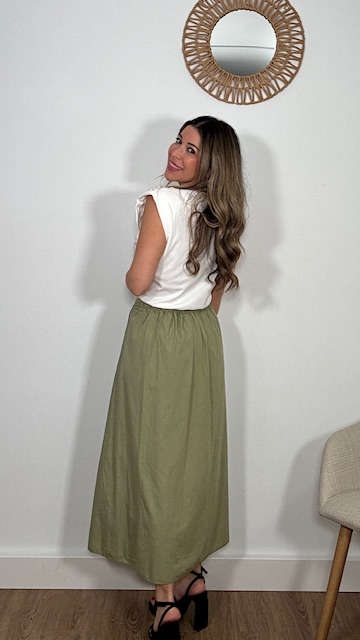 Falda larga de corte asimétrico en color verde caza, lleva cinturilla elástica. talla única válida desde la 36 hasta la 42.