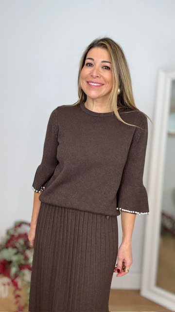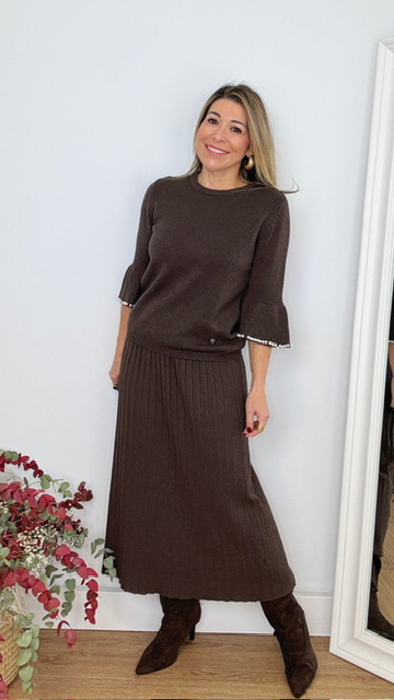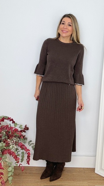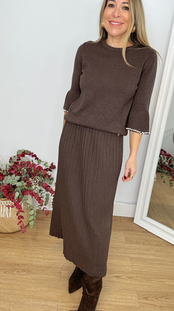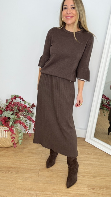 Falda de punto canalé en color marrón. Talla única desde la 36 hasta la 44.