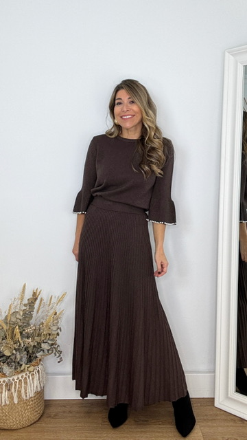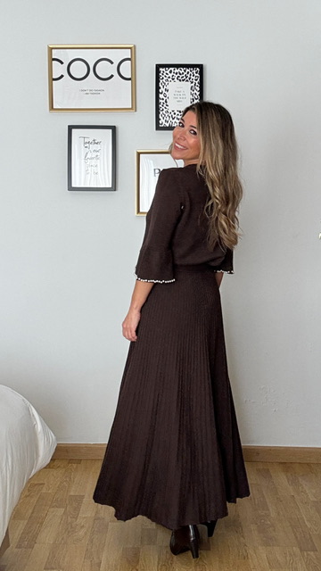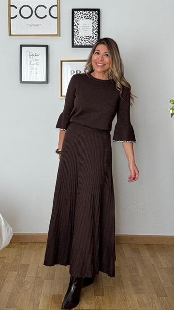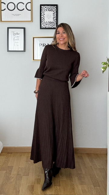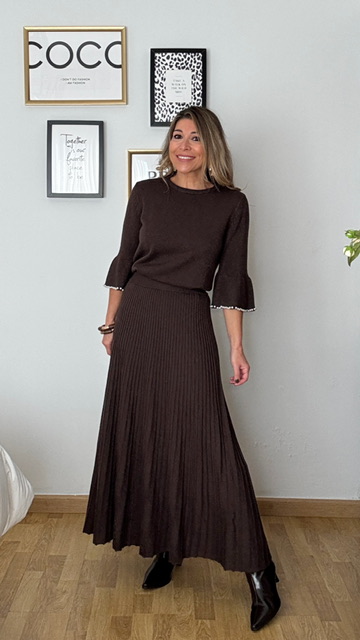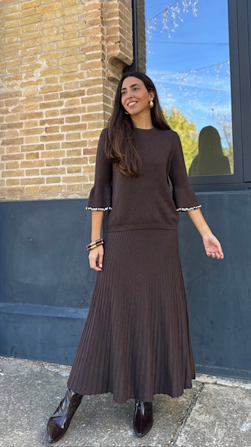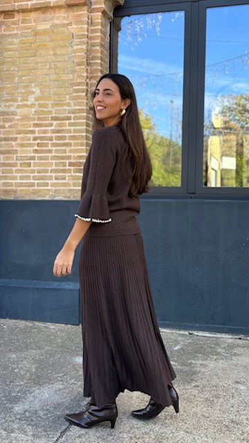 Falda confeccionada en tejido de punto en color marrón. Talla única válida desde la 36 hasta la 44.