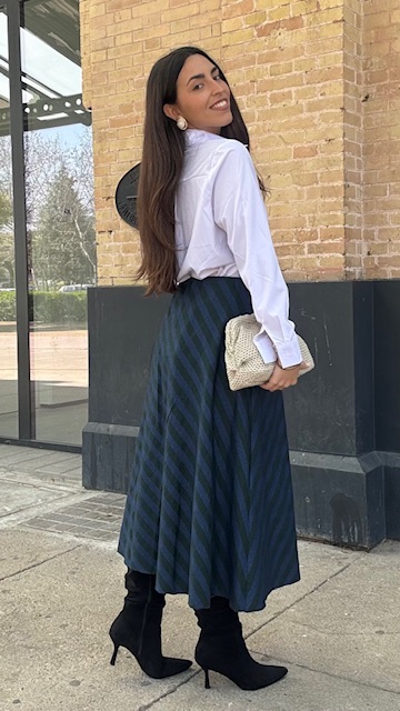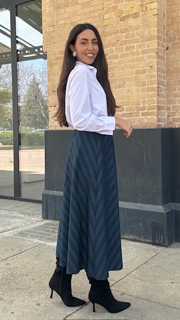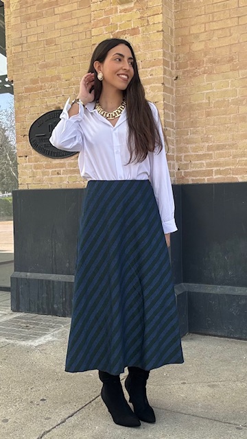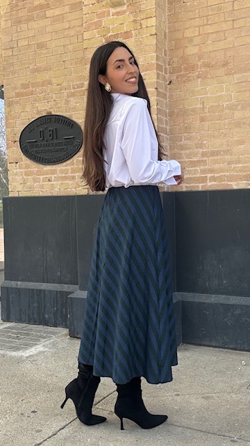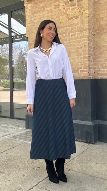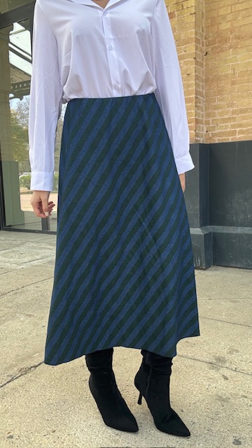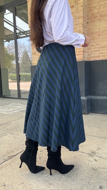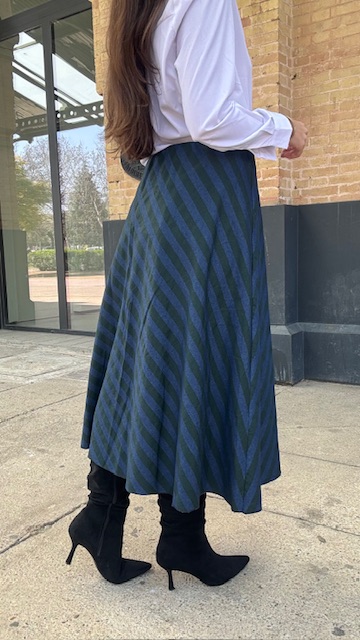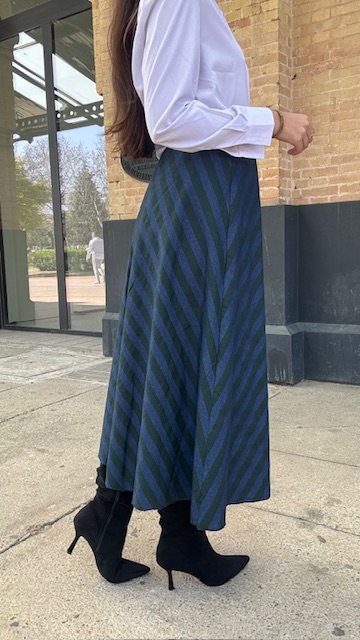 Falda de capa con cinturilla elástica con estampado de rayas en denim y verde botella. Talla única válida desde la 38/40 hasta la talla 44.