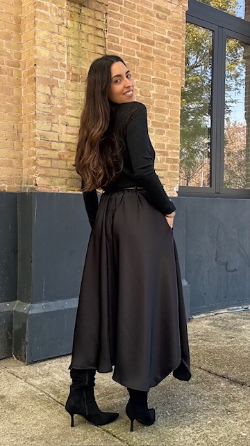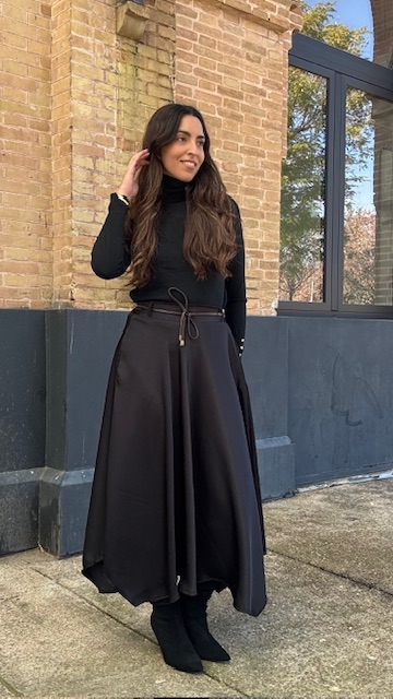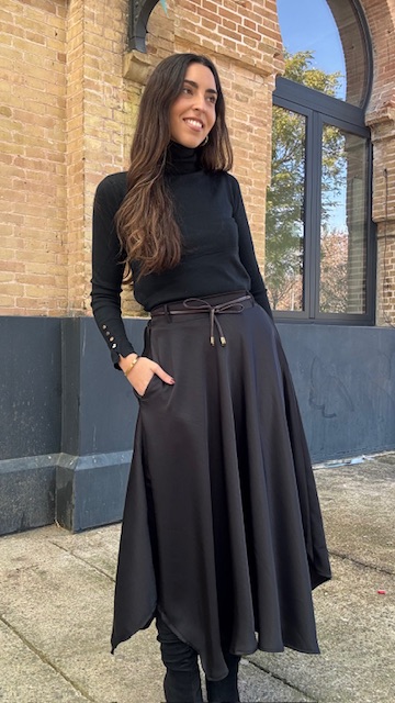 Falda satinada de capa con cinturilla elástica en color negra. Talla única válida desde la 36 hasta la 44.