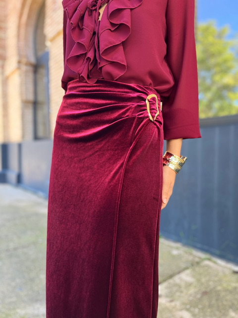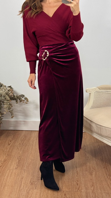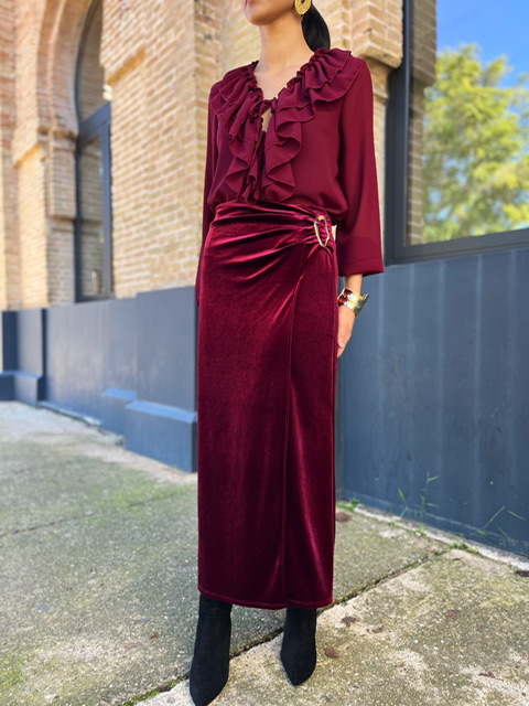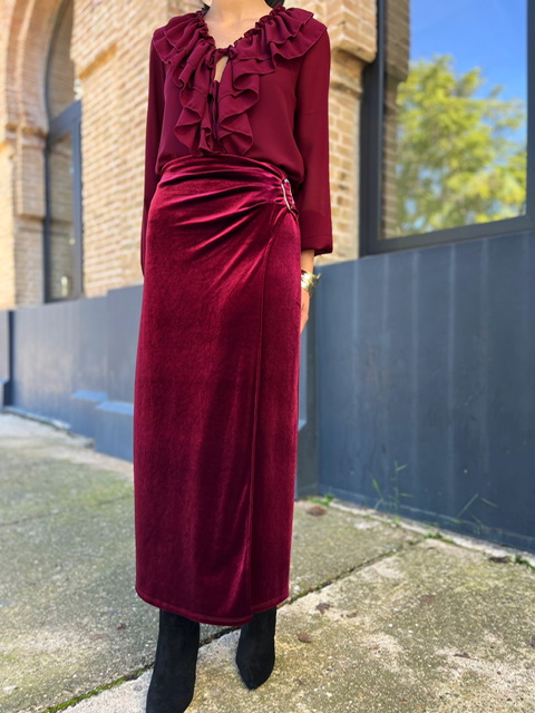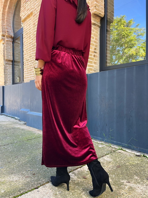 Falda midi de terciopelo con hebilla dorada en el lateral izquierdo. Con cinturilla elástica. Talla válida desde la 36 hasta la talla 42.