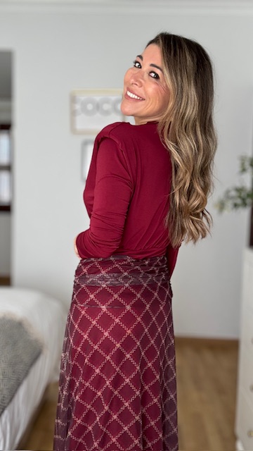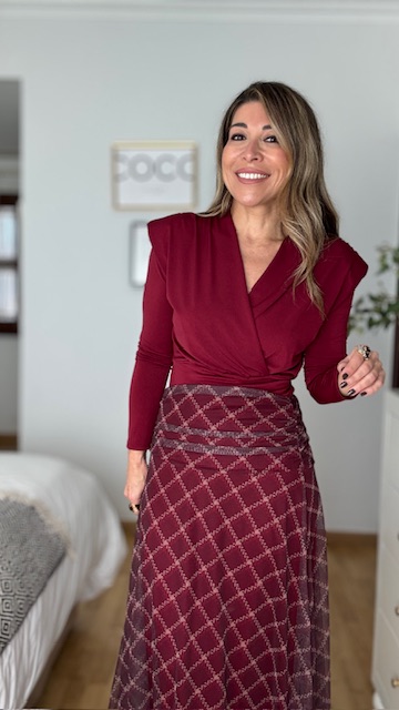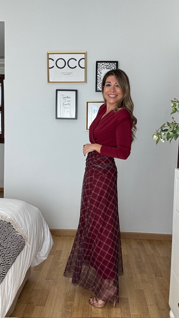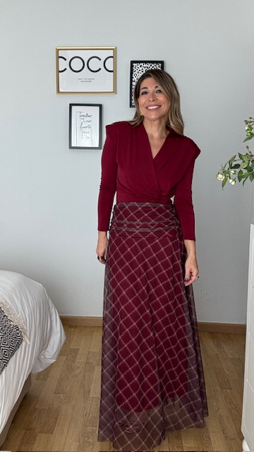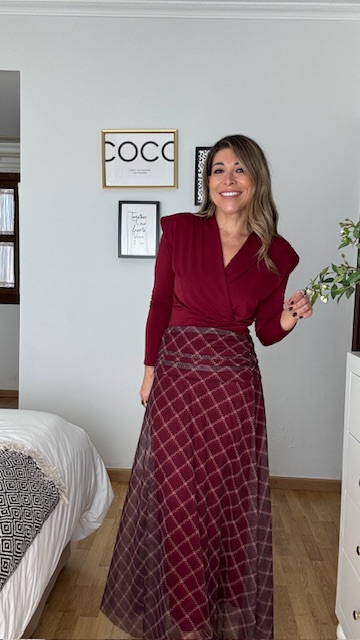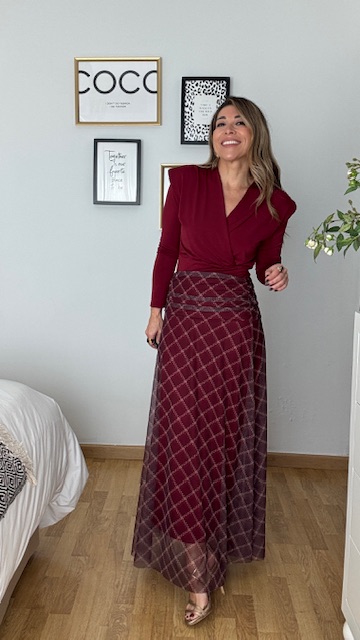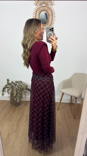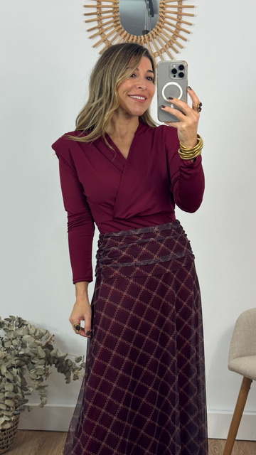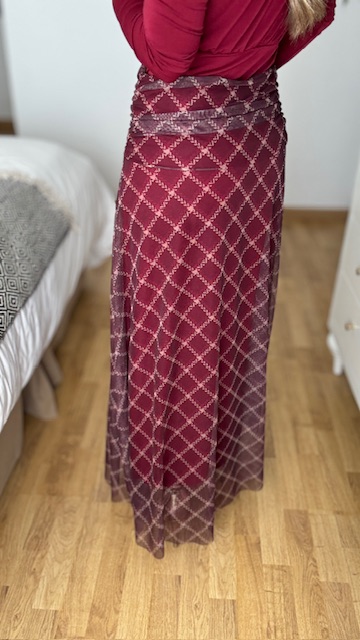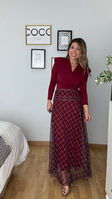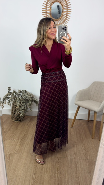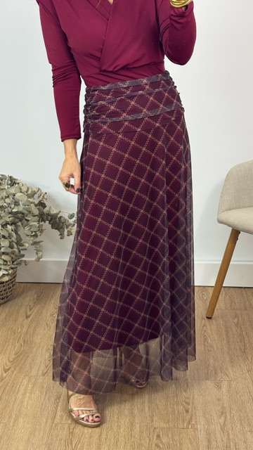 Falda de tul en color burdeos con estampado de cuadros en tonos camel y forro interior. Talla única válida desde la 36 hasta la 44.