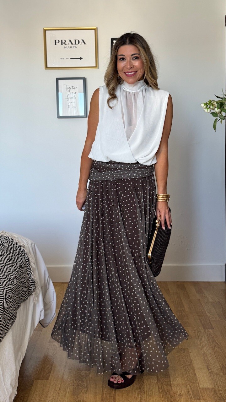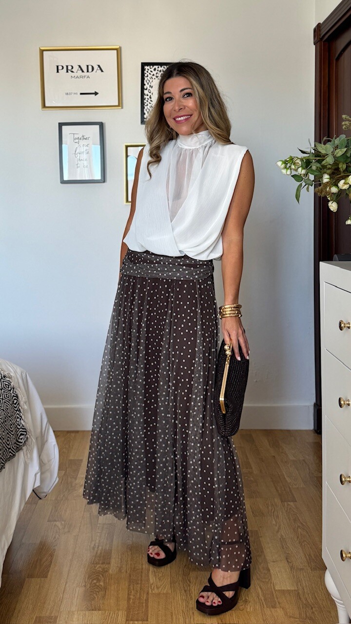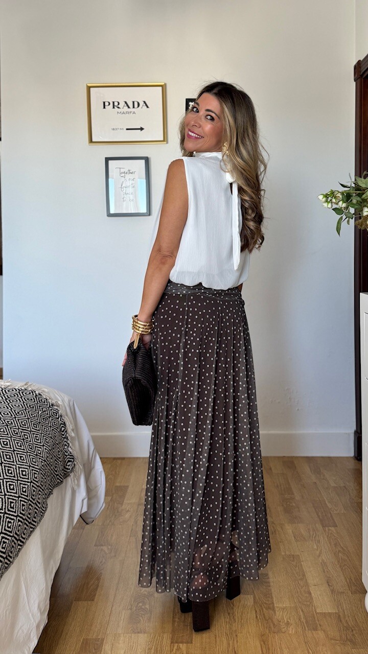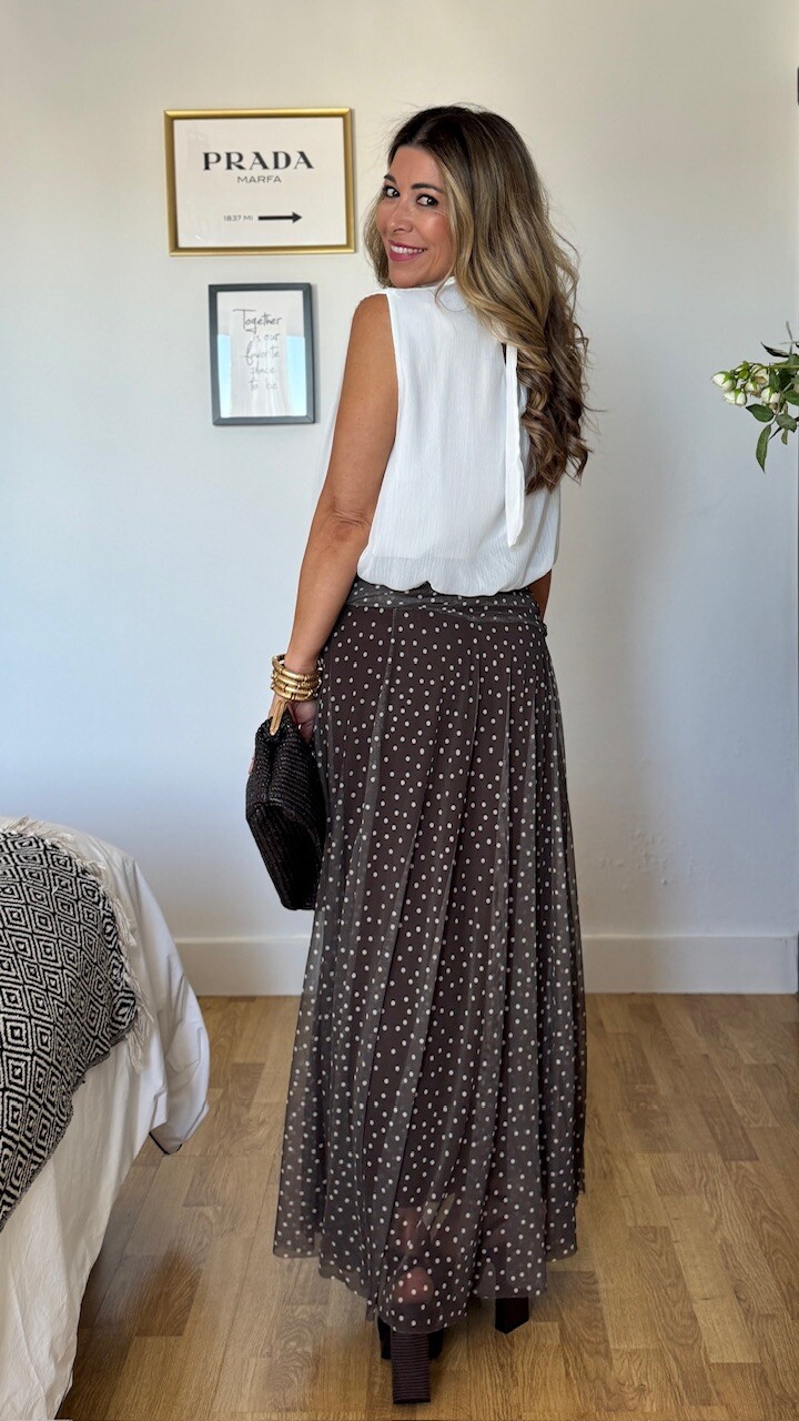 Falda de tul en color marrón con lunares en color blanco. Lleva cinturilla elástica y forro en su interior. Talla única válida desde la talla 36 hasta la talla 44.