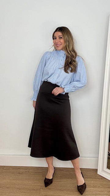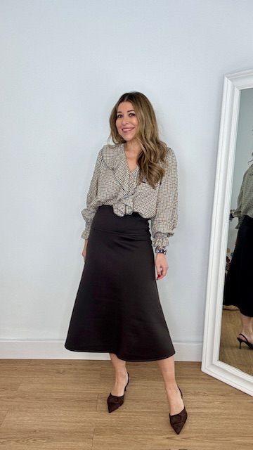 Falda midi de capa con cinturilla elástica en color marrón chocolate. Talla única válida desde la 36 hasta la 38.