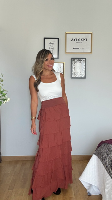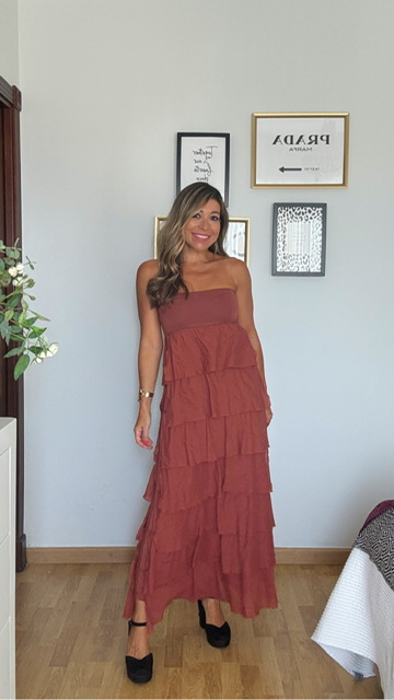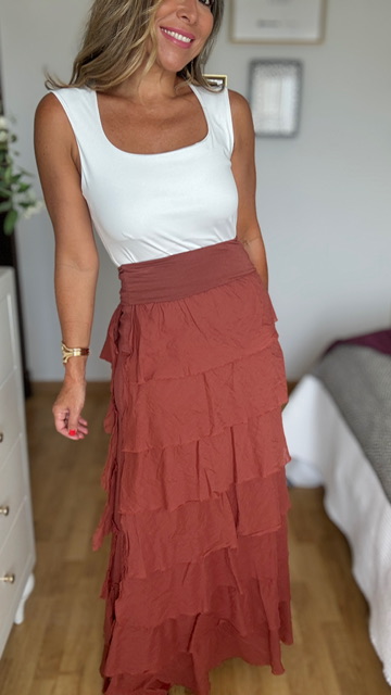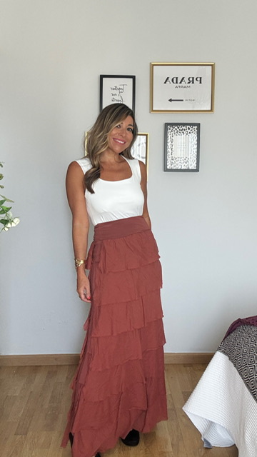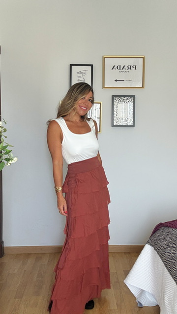 Falda de volantes en color teja que se puede poner también como un vestido palabra de honor. Talla única válida desde la 36 hasta la 42.