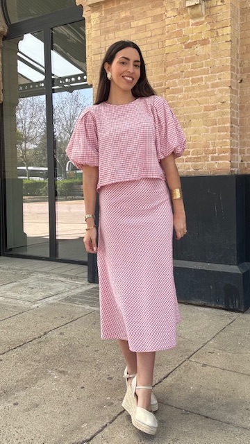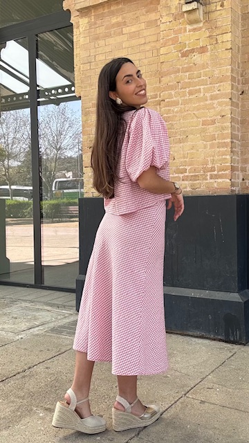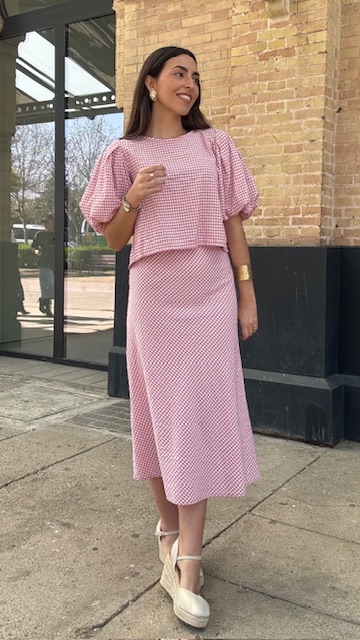Falda con estampado vichy evasé en color rosa. Talla única válida desde la 36 hasta la 40/42.