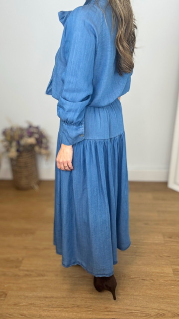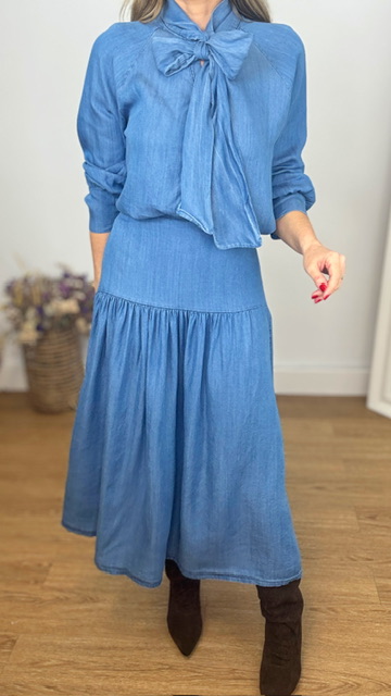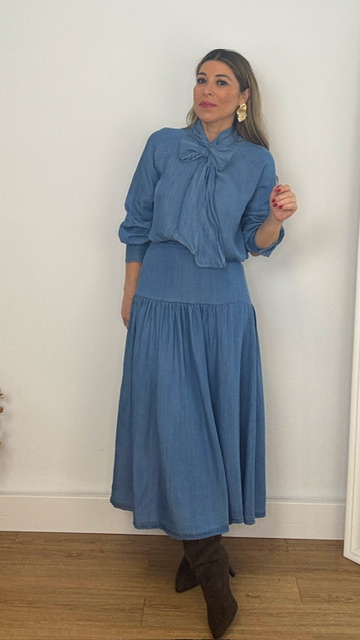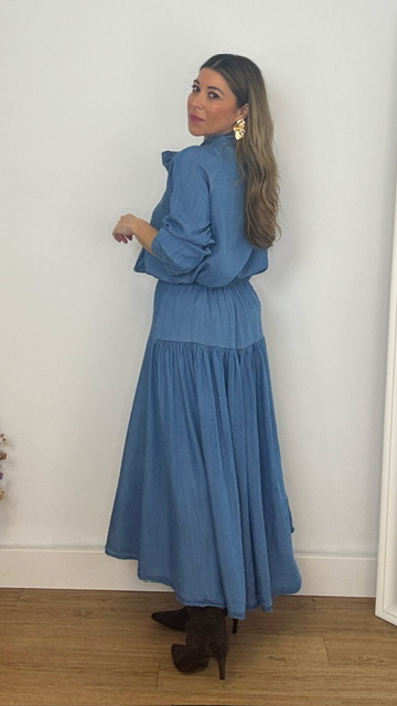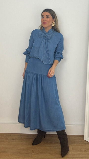 Falda denim con vuelo y cinturilla elástica. Talla única válida desde la 36 hasta la 44.