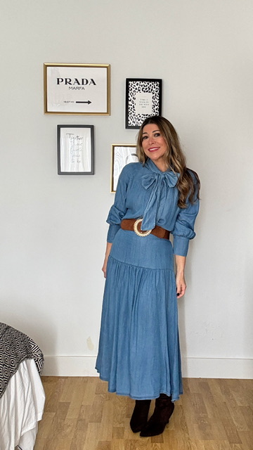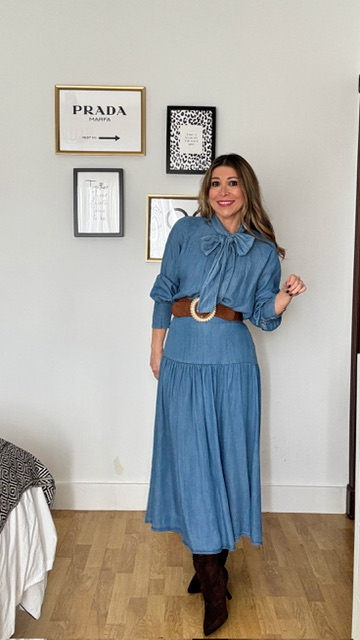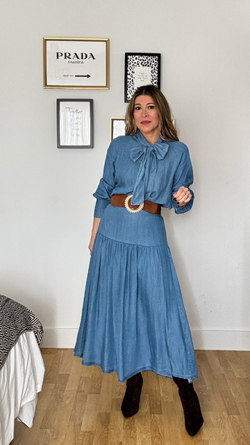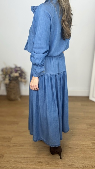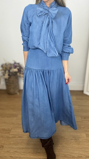 Falda denim con vuelo y cinturilla elástica. Talla única válida desde la 36 hasta la 42.