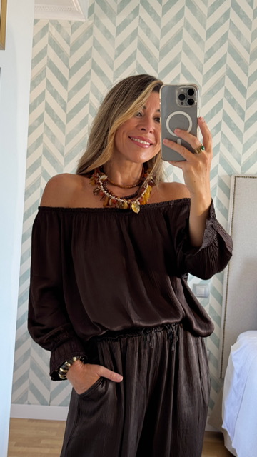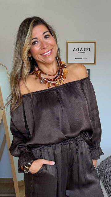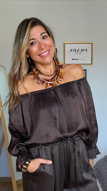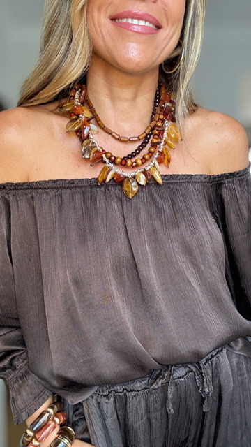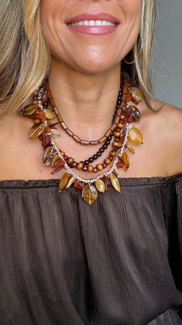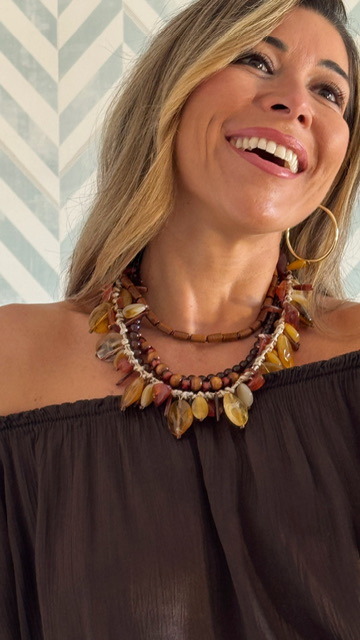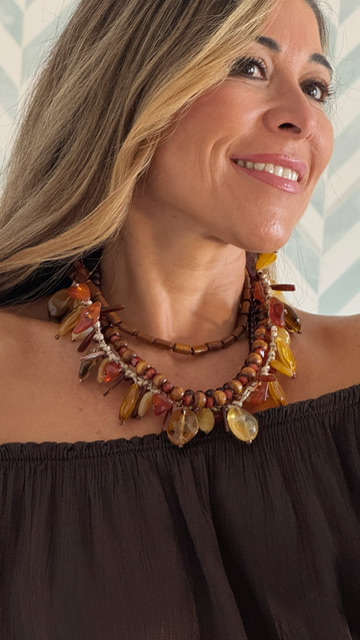 Gargantilla con cinco collares unidos con distintas formas y largos predominando en color ámbar.