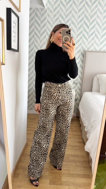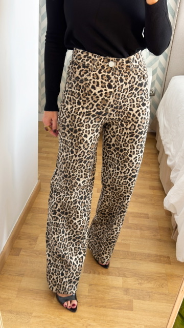 Jeans rectos con estampado de animal print en tono marrón claro. Disponible por tallas.