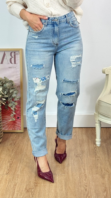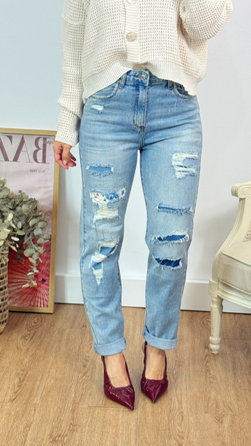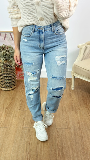 Jeans tipo boyfriend rotos denim en color azul . Disponible por tallas.