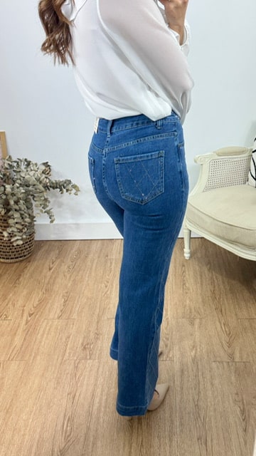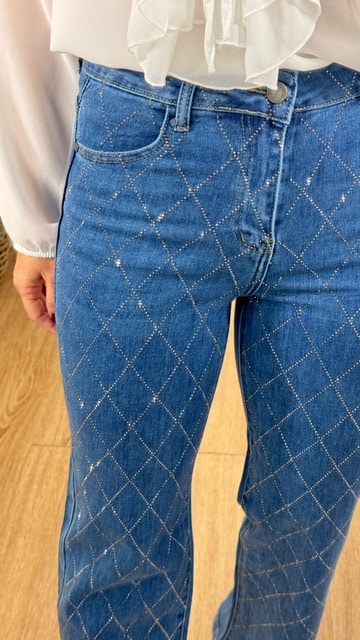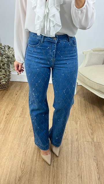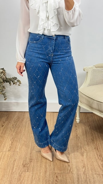 Pantalón vaquero de corte recto con detalles de strass en ls parte delantera y bolsillo trasero. Disponible por tallas desde la XS hasta la XL.