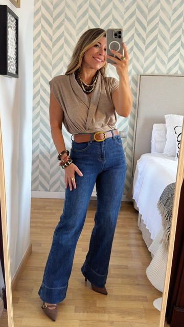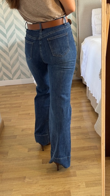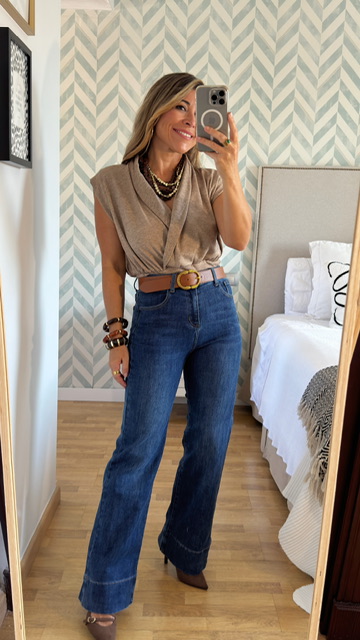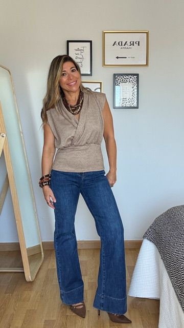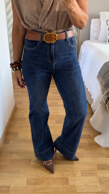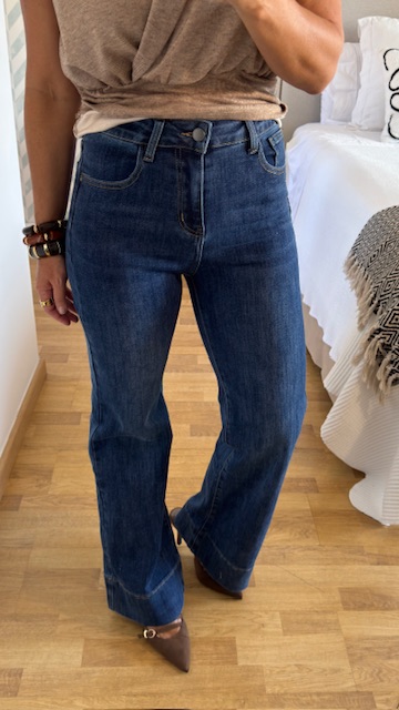 Pantalón vaquero de estilo flare en color azul. Tiro medio. lleva elastano y tallan normal. La modelo lleva talla S.