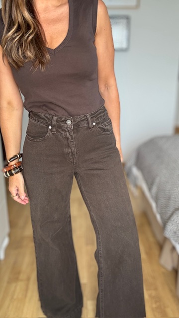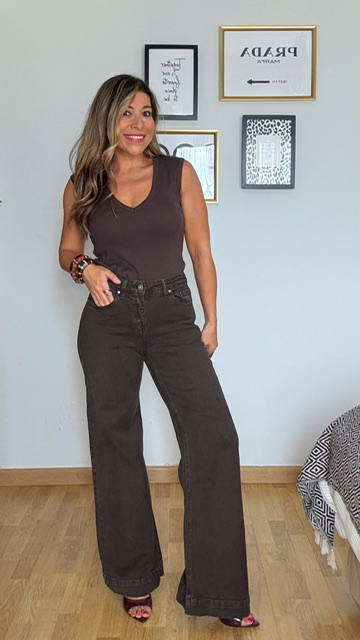 Jeans de corte recto en color marrón chocolate con tiro alto. Tallas desde la XS hasta la XL.