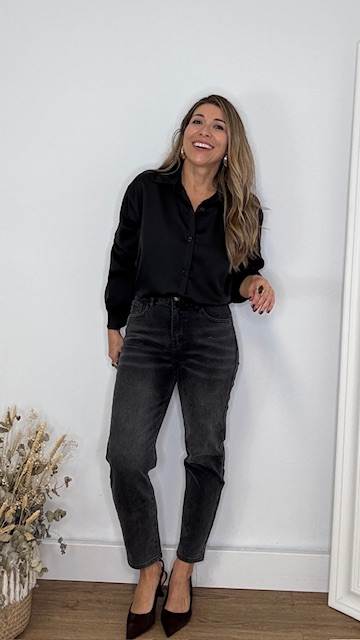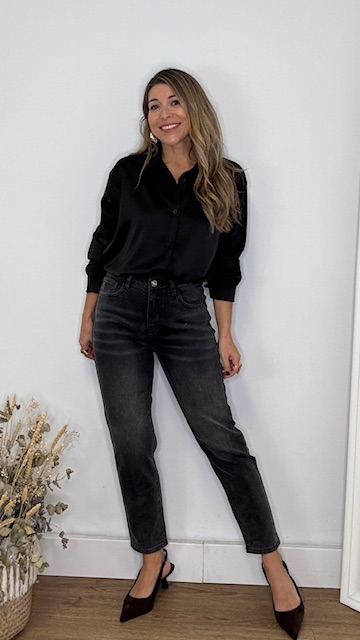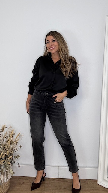 Jeans mom fit en color gris desgastado. Disponible por tallas.