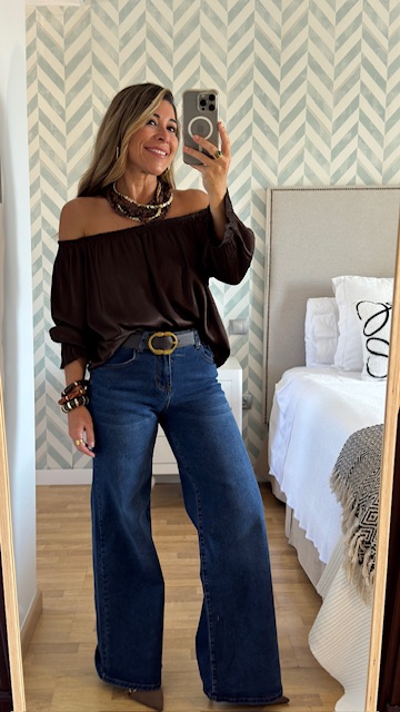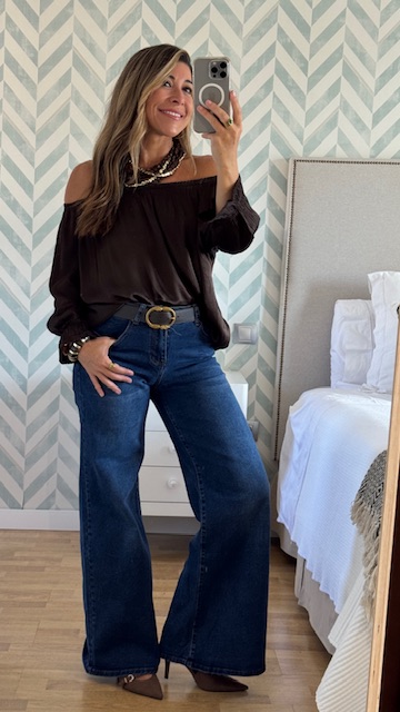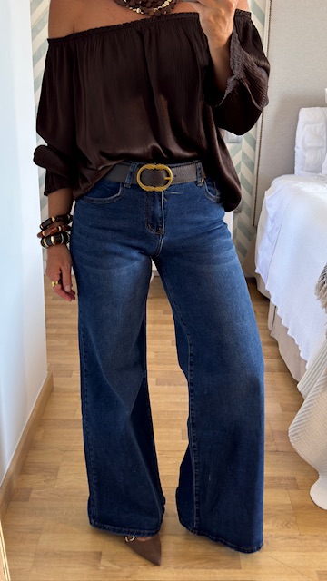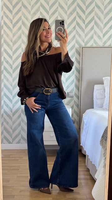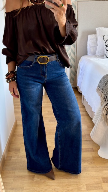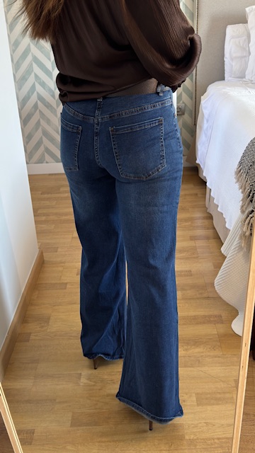 Pantalón vaquero con pata de elefante en color azul. Tiro medio. lleva elastano y tallan normal. La modelo lleva talla S.